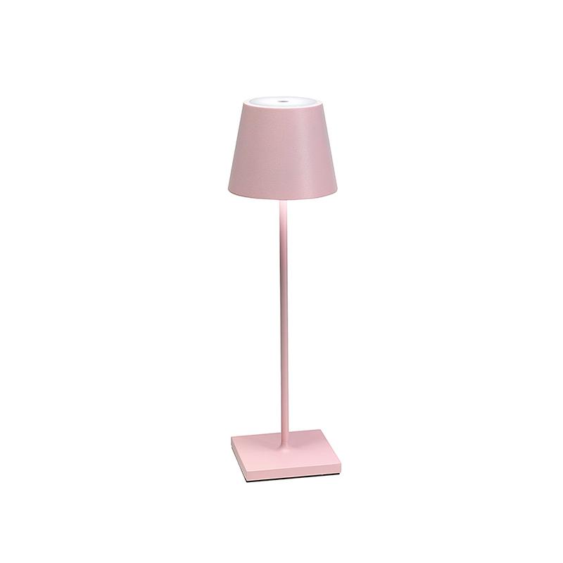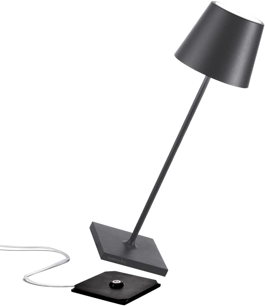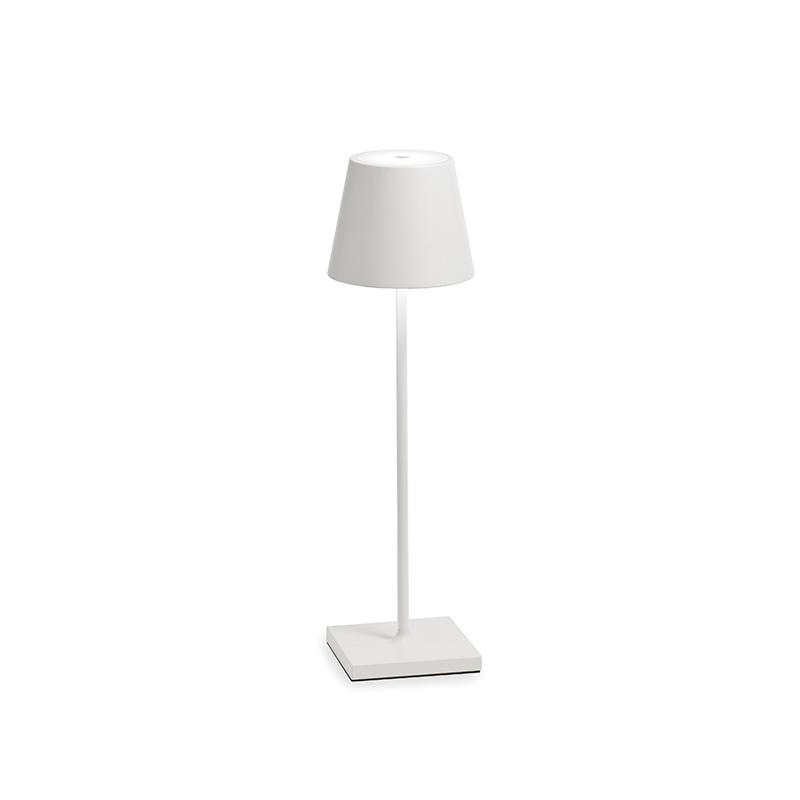 Lampe de table rechargeable équipée d'une base de charge par contact, avec corps en aluminium peint, diffuseur en polycarbonate et source lumineuse à LED.