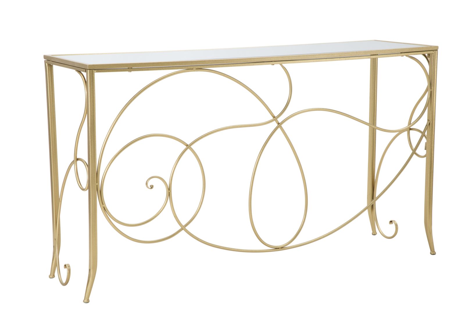 Console rectangulaire en métal doré et plateau en verre miroir aux lignes douces et sinueuses. Le métal doré donne une touche de classe à n'importe quel environnement glamour. Les lignes géométriques et arrondies se marient parfaitement avec tout type de mobilier.