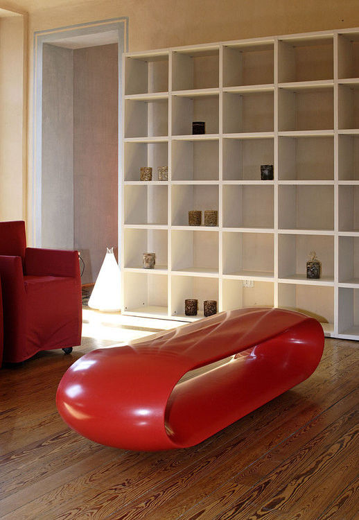Une particularité est l'ouverture à l'intérieur du banc de jardin qui allège sa structure et son impact visuel tout en lui conférant une plus grande résistance.