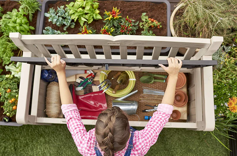Le compartiment de rangement pratique de 265 litres est idéal pour ranger coussins, accessoires de jardin ou jeux, en les gardant au sec et aérés.