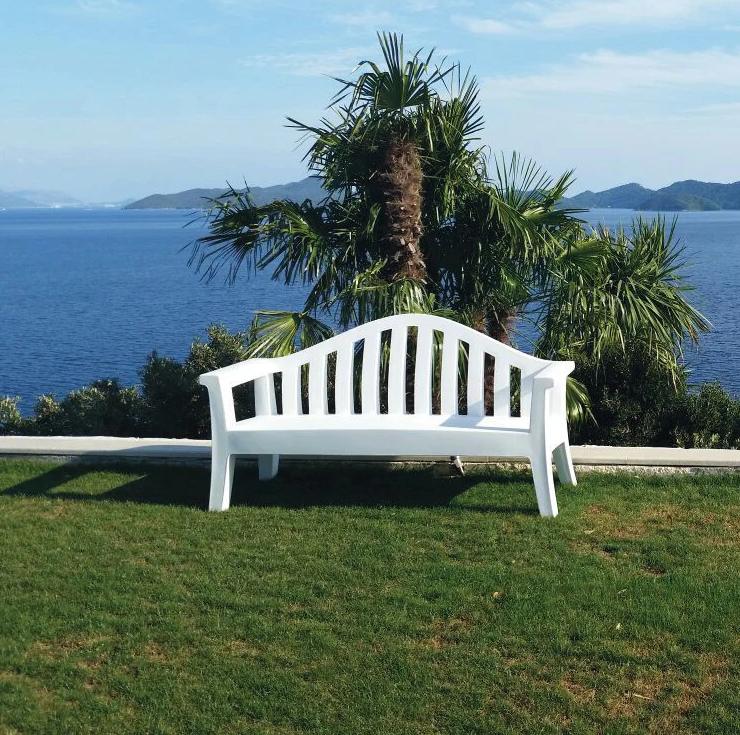 Giulietta est un banc de Paolo Rizzatto pour Serralunga, réalisé en polyéthylène. Protection UV, 100% recyclable, résistance aux chocs.