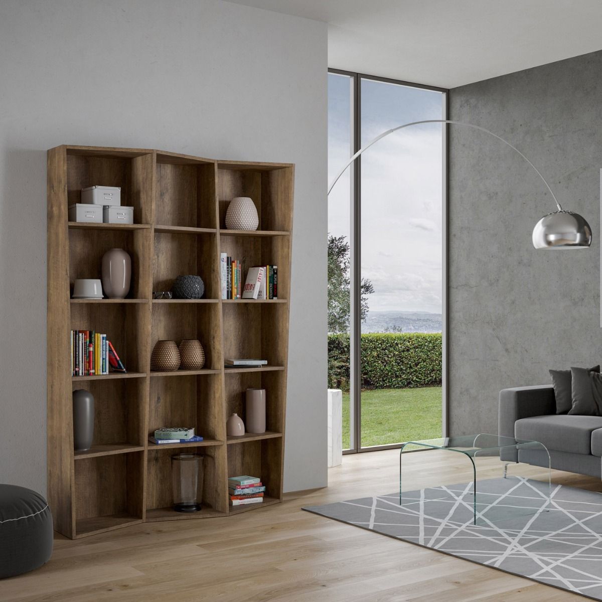 La bibliothèque TREK est une bibliothèque composée de panneaux trapézoïdaux, qui rendent son design innovant et raffiné à la fois.
