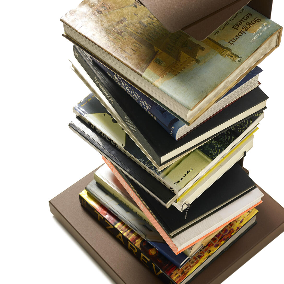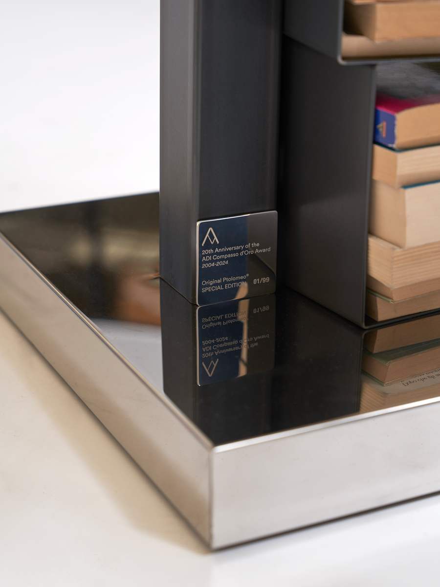 Conçu par Bruno Rainaldi, lauréat du Compasso d'Oro 2004 , Original Ptolomeo est né de l'observation plutôt que d'une procédure formelle et traduit une idée simple et ingénieuse en un meuble, transformant une pile de livres en objet design . Une bibliothèque aussi "banale" qu'audacieuse, pour devenir une icône contemporaine , une œuvre d'art harmonieuse et comme une œuvre d'art, pour sa propre protection, dédicacée sur la base de la signature du créateur.