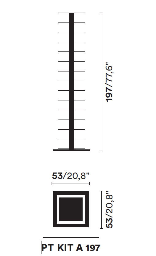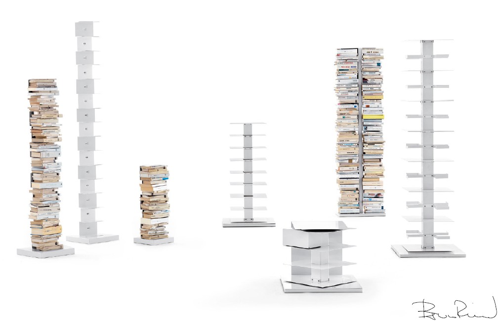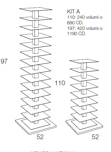 Bibliothèque verticale autoportante et rotative à 360 °. Base gravée de la signature du designer. Disponible en trois versions différentes: Kit A, Kit B, Kit C. Finition: Structure et étagères en métal laqué blanc ou noir. Base en acier inoxydable poli pour la version noire et laquée blanc pour la version blanche. Accessoires: Extension en métal laqué blanc ou noir. L'aimant arrête le cd. Dimensions: 52x52xh197 cm Le prix se réfère à la mise en place A composée de 14 étagères espacées de 13 cm, positionnant les livres horizontalement. Chaque étagère contient jusqu'à 30 volumes, environ 420 livres au total. Précisez par email à [email protected] si vous souhaitez la variante WHITE BASE WHITE ou BLACK BASE INOX