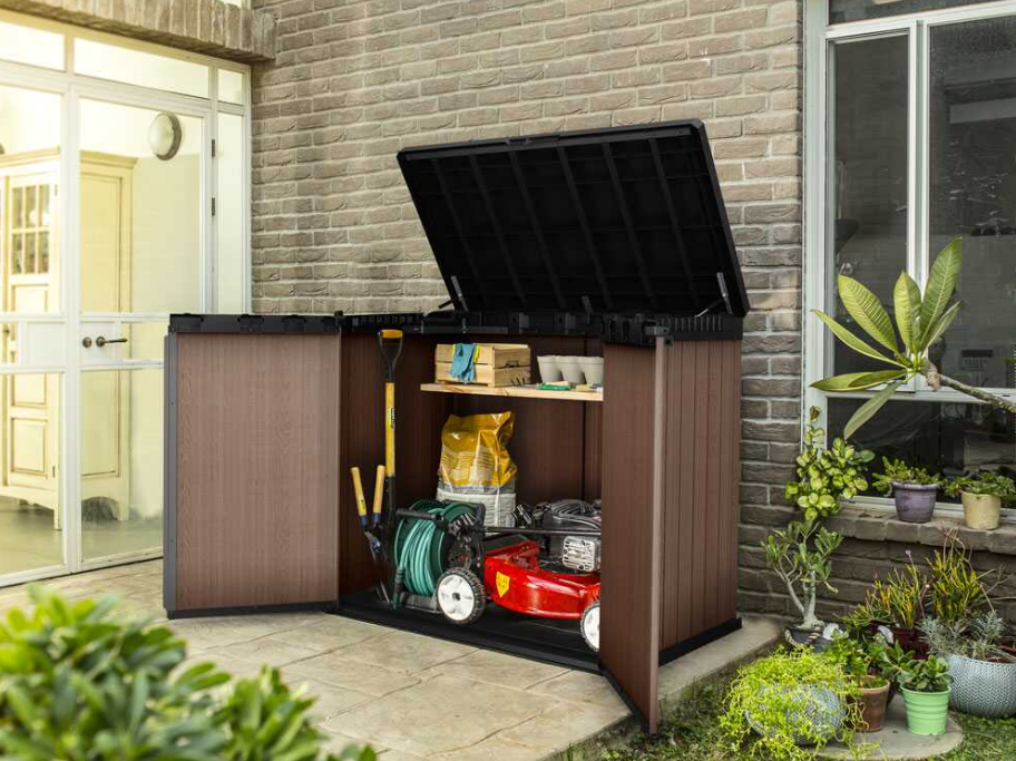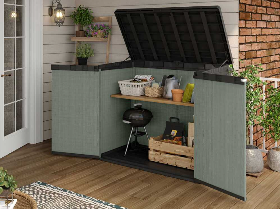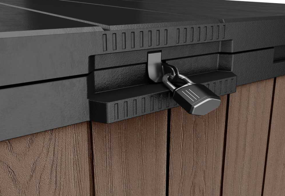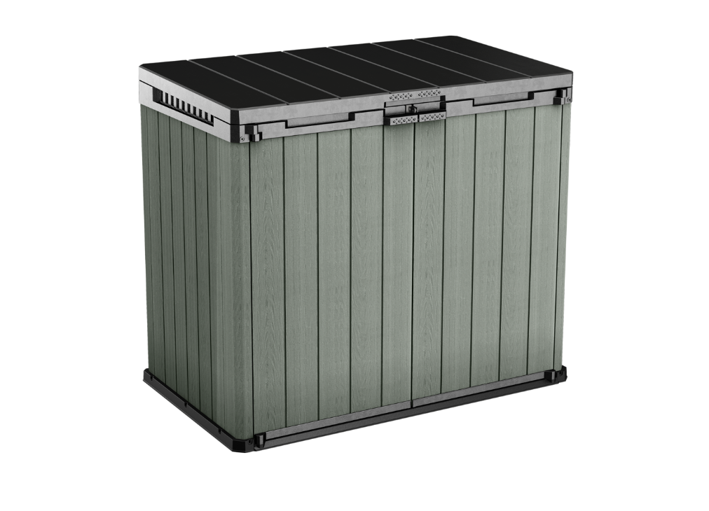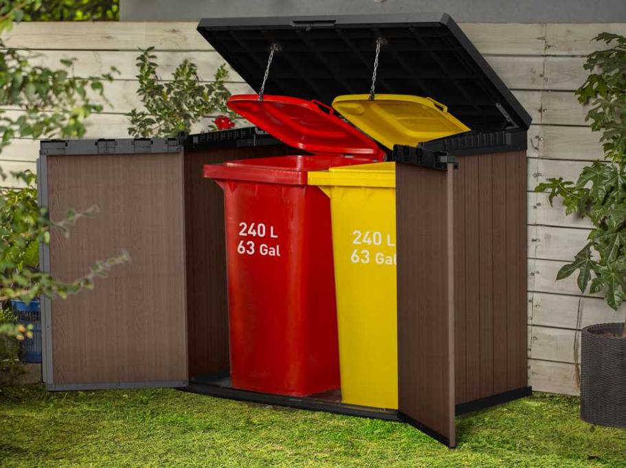 Son design compact et élégant effet bois le rend parfait même pour les terrasses ou les cours avec un espace limité, offrant une grande capacité sans encombrement excessif.