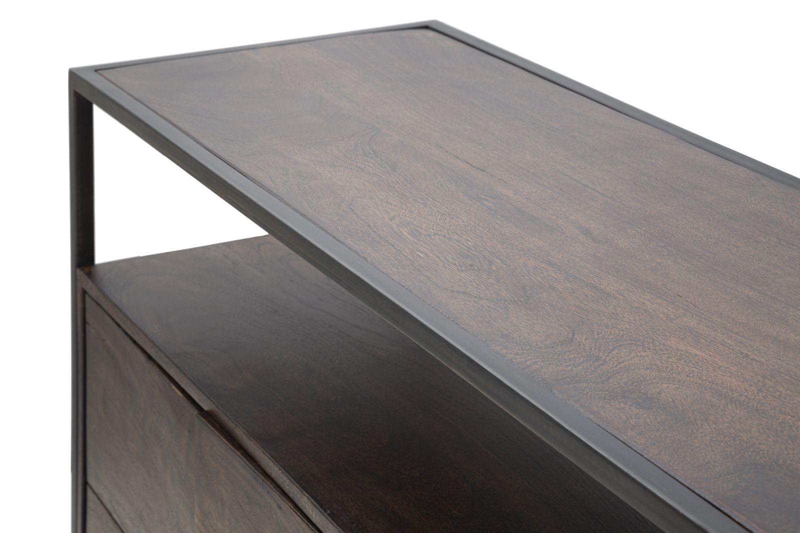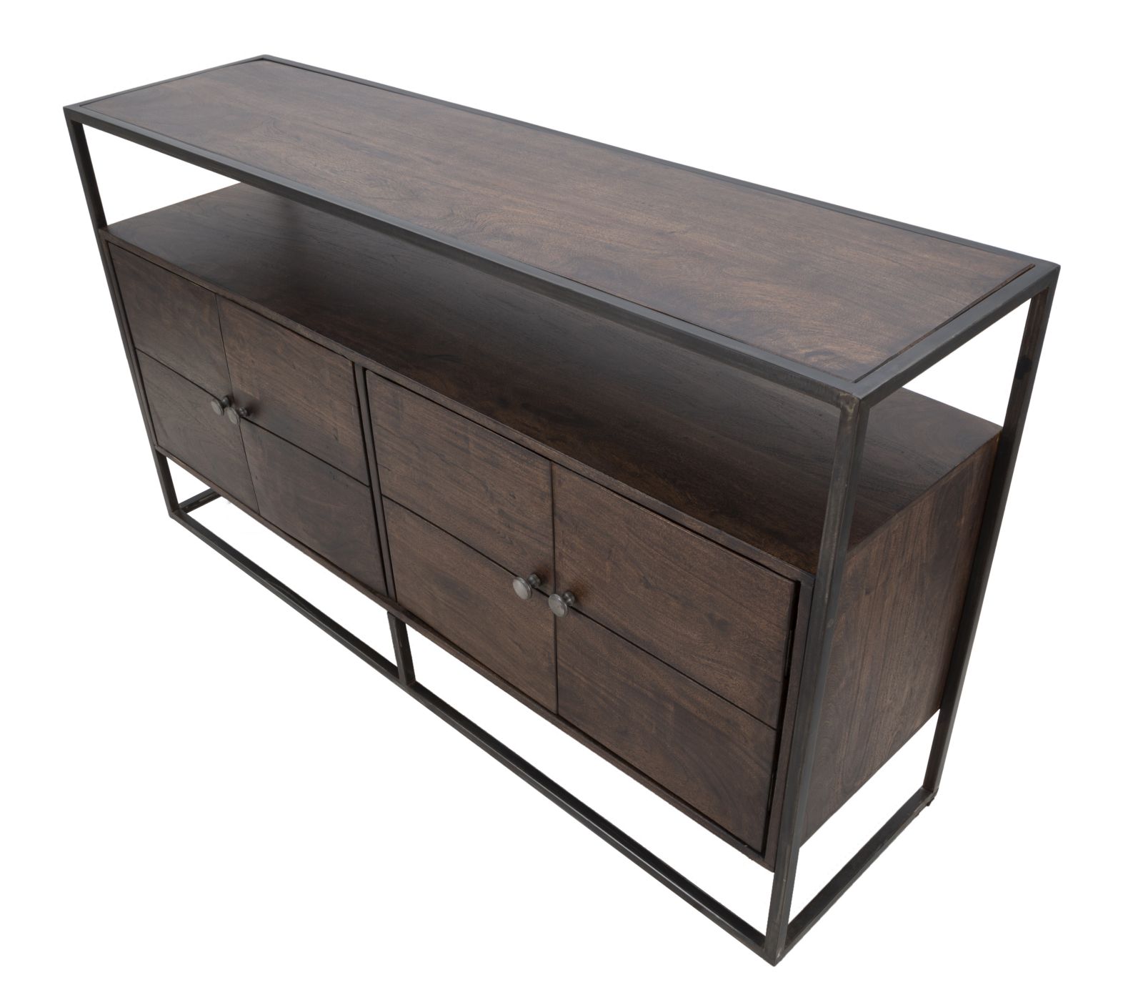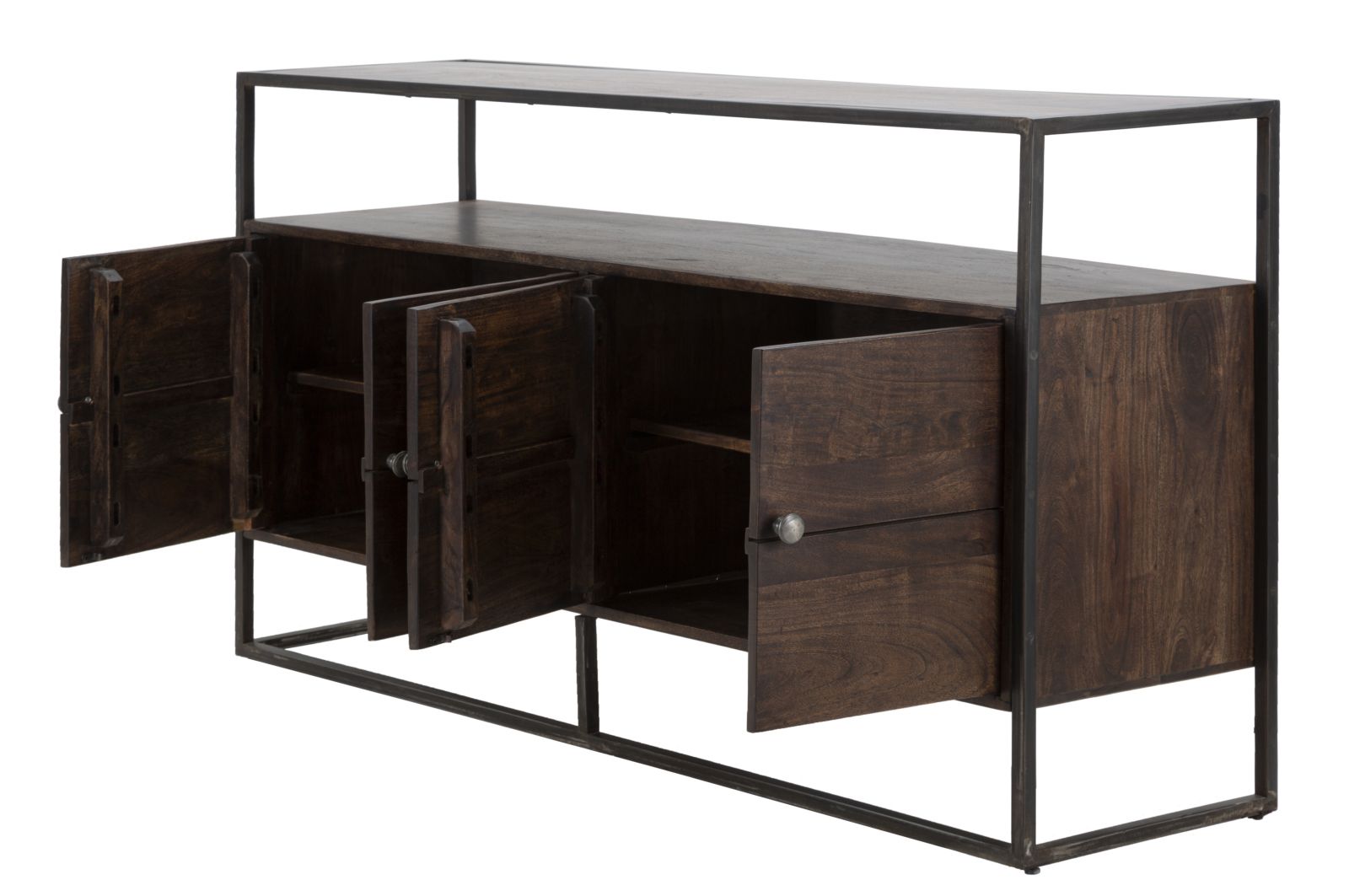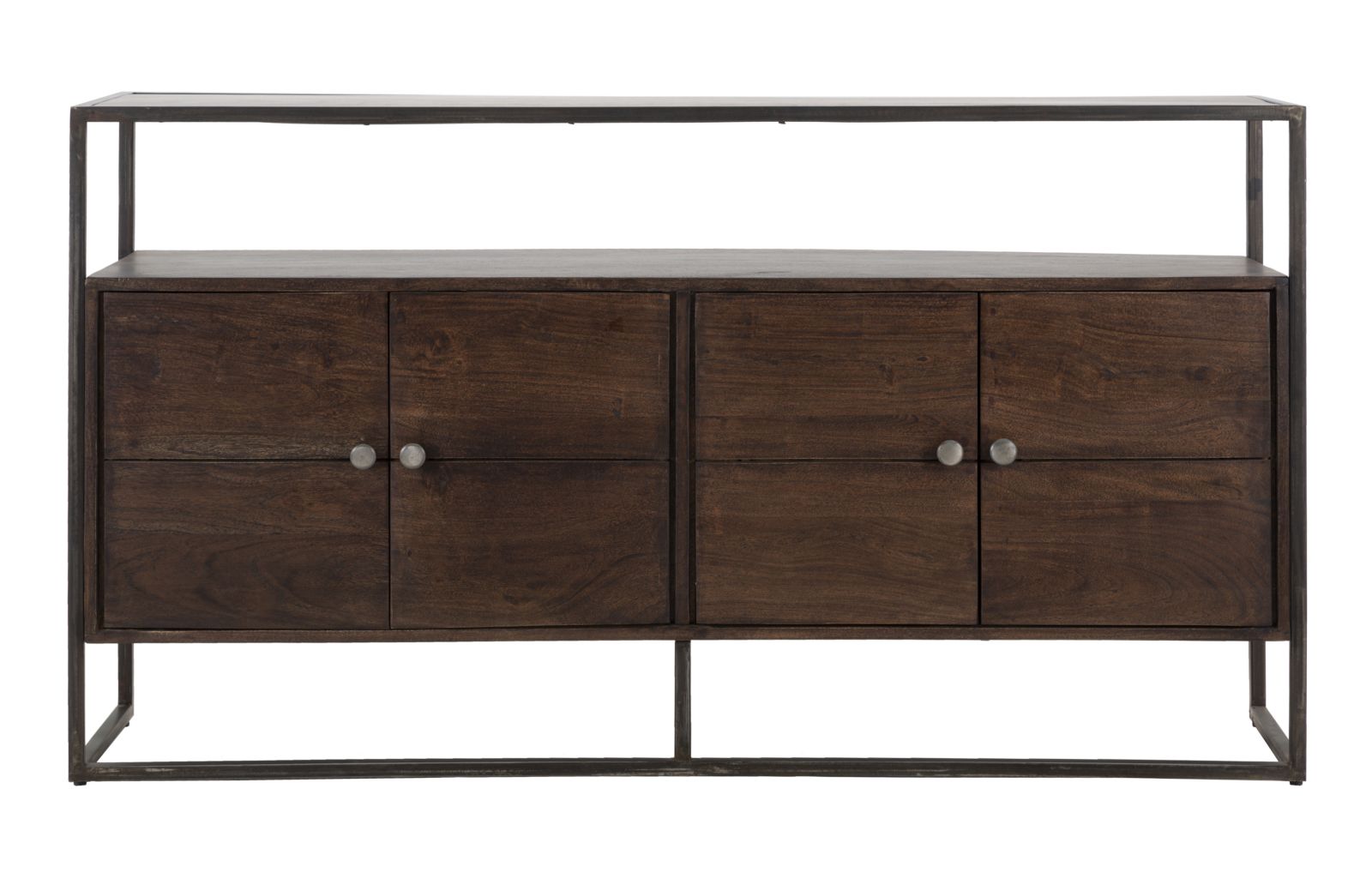 Armoire en bois d'acacia massif avec étagère et 4 portes encadrées d'une structure en métal noir aux lignes épurées et carrées qui donne une touche de modernité à une pièce extrêmement élégante et classique.