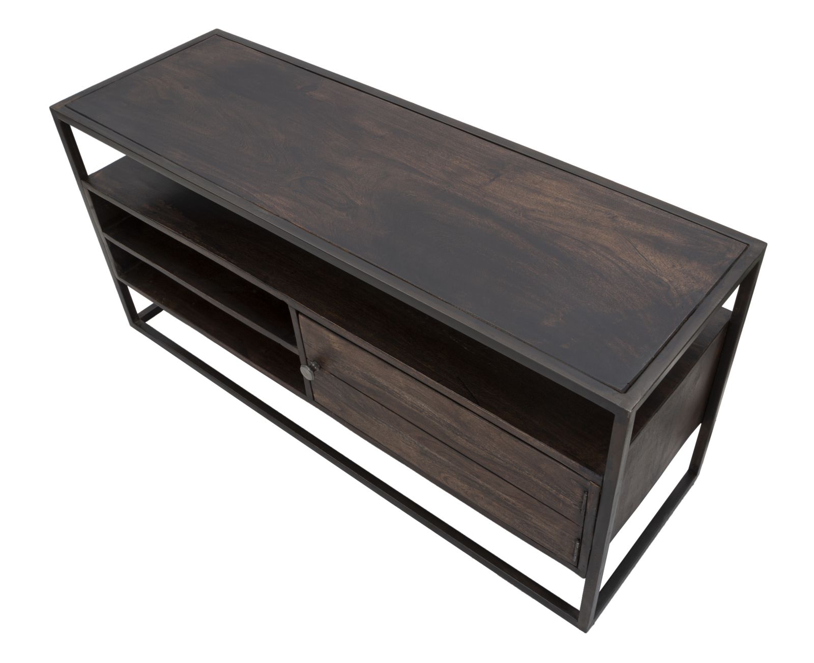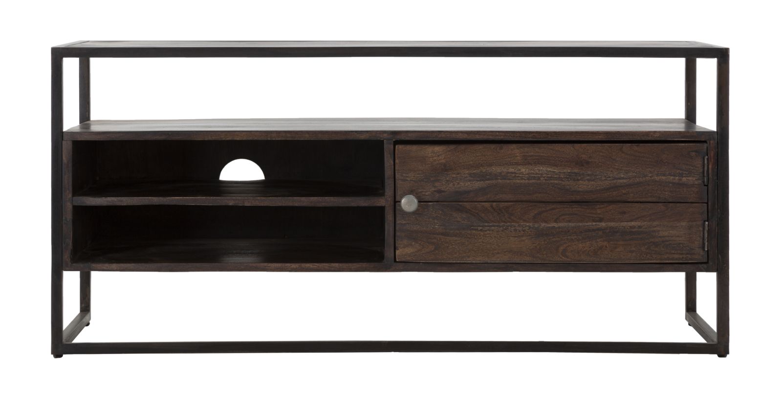 Meuble TV en bois d'acacia massif avec 3 étagères et porte encadrées d'une structure en métal noir aux lignes épurées et carrées qui donne une touche de modernité à une pièce extrêmement élégante et classique.