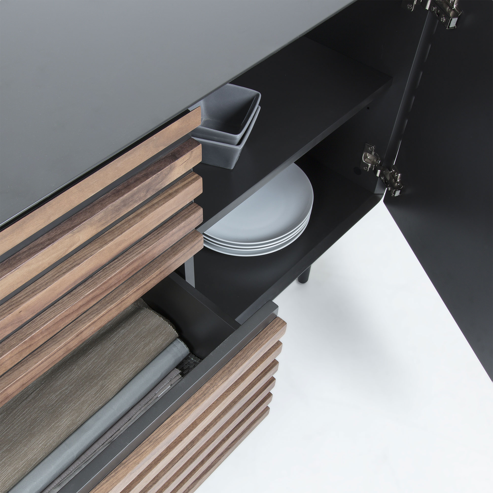 | Matériel | 72 % MDF E0 (panneau de fibres à densité moyenne à faible émission de formaldéhyde classe E0), 14 % acier, 14 % placage de noyer (Juglans nigra) |