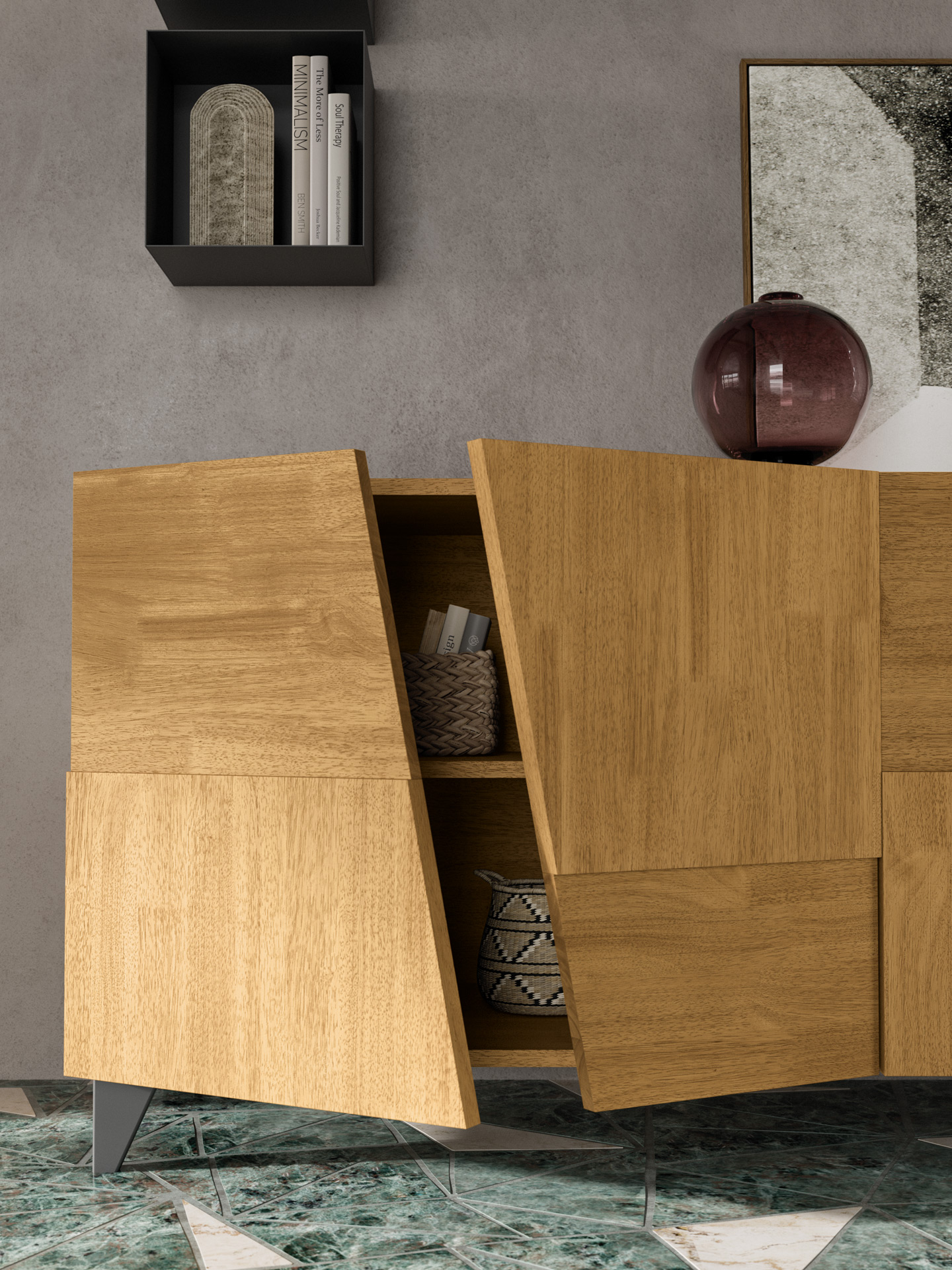 Découvrez le buffet TRAPEZE, une création unique qui allie un design géométrique raffiné à la solidité du bois massif. Ce meuble, avec ses jeux de volumes et ses lignes tridimensionnelles, réinterprète les standards de beauté traditionnels dans une touche moderne.
