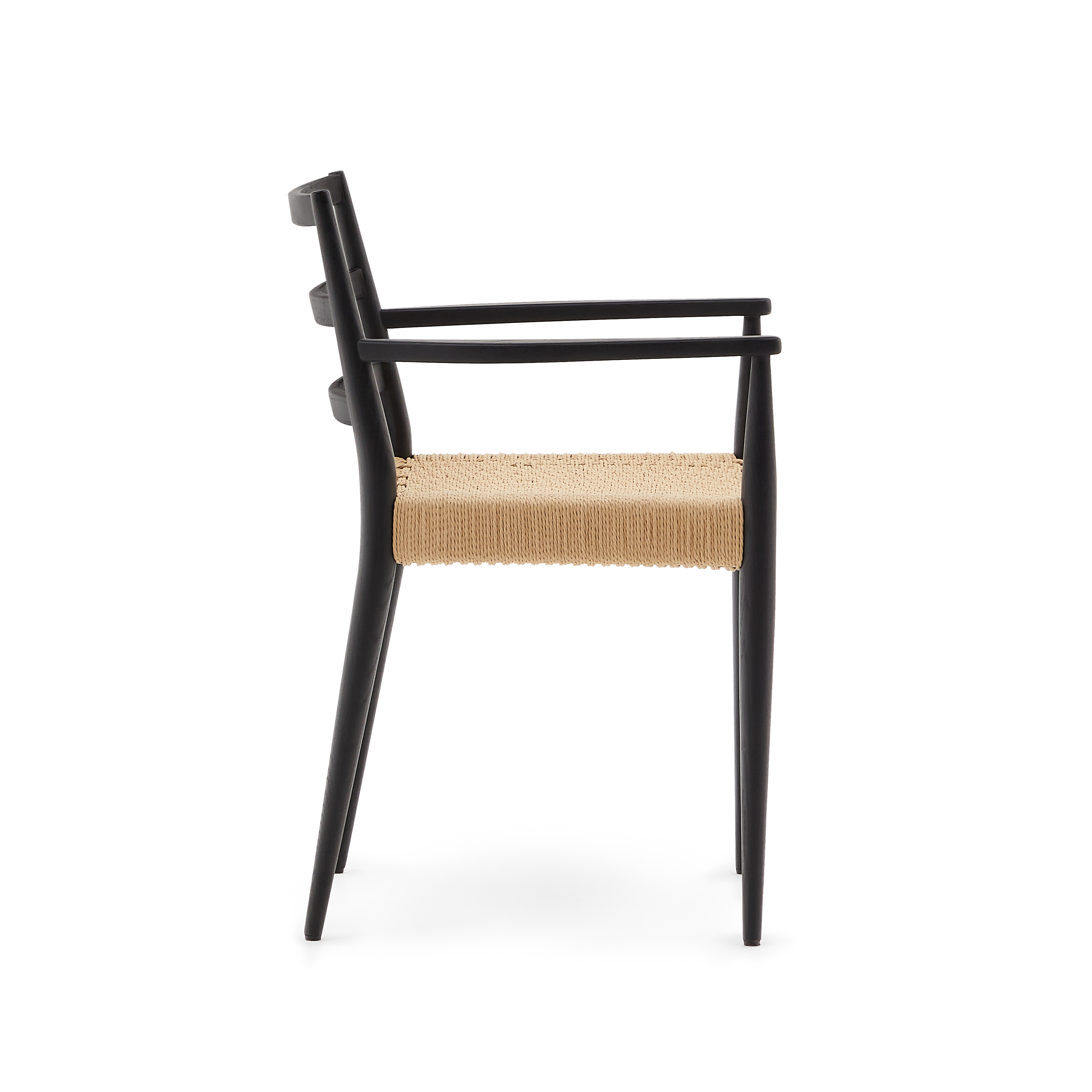 Chaise Analy avec accoudoirs en bois de chêne massif finition noire et assise en corde 100% FSC