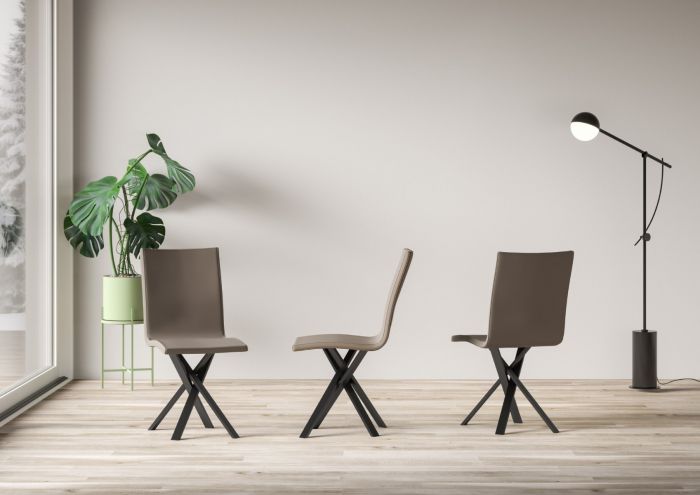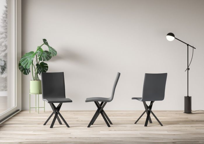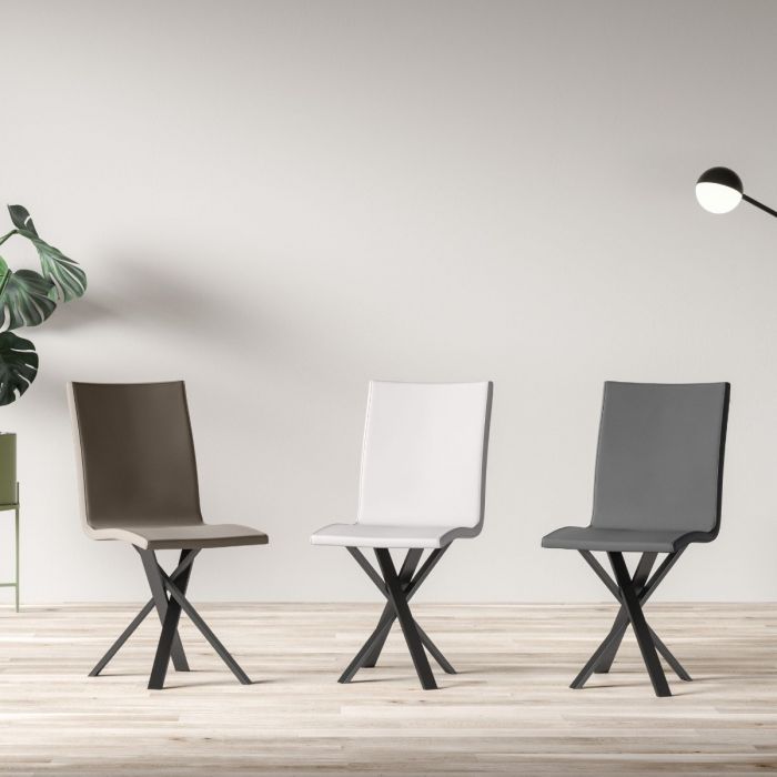 Chaise Aury Soft avec pieds en métal peint anthracite et coque en bois recouverte de similicuir légèrement rembourré. Cette chaise est sans accoudoirs.