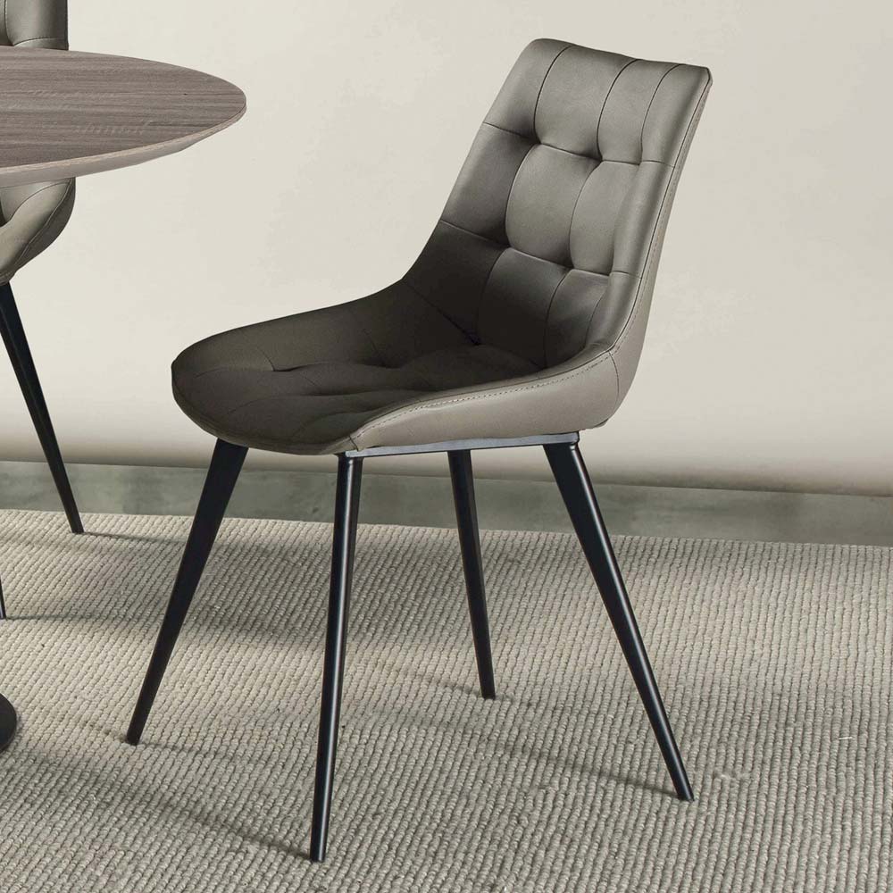 Caractérisée par des pieds en métal peint en noir et une assise recouverte de cuir écologique gris tourterelle ou gris titane, cette chaise est agrémentée d'un travail capitonné raffiné qui ajoute une touche de raffinement et de style.