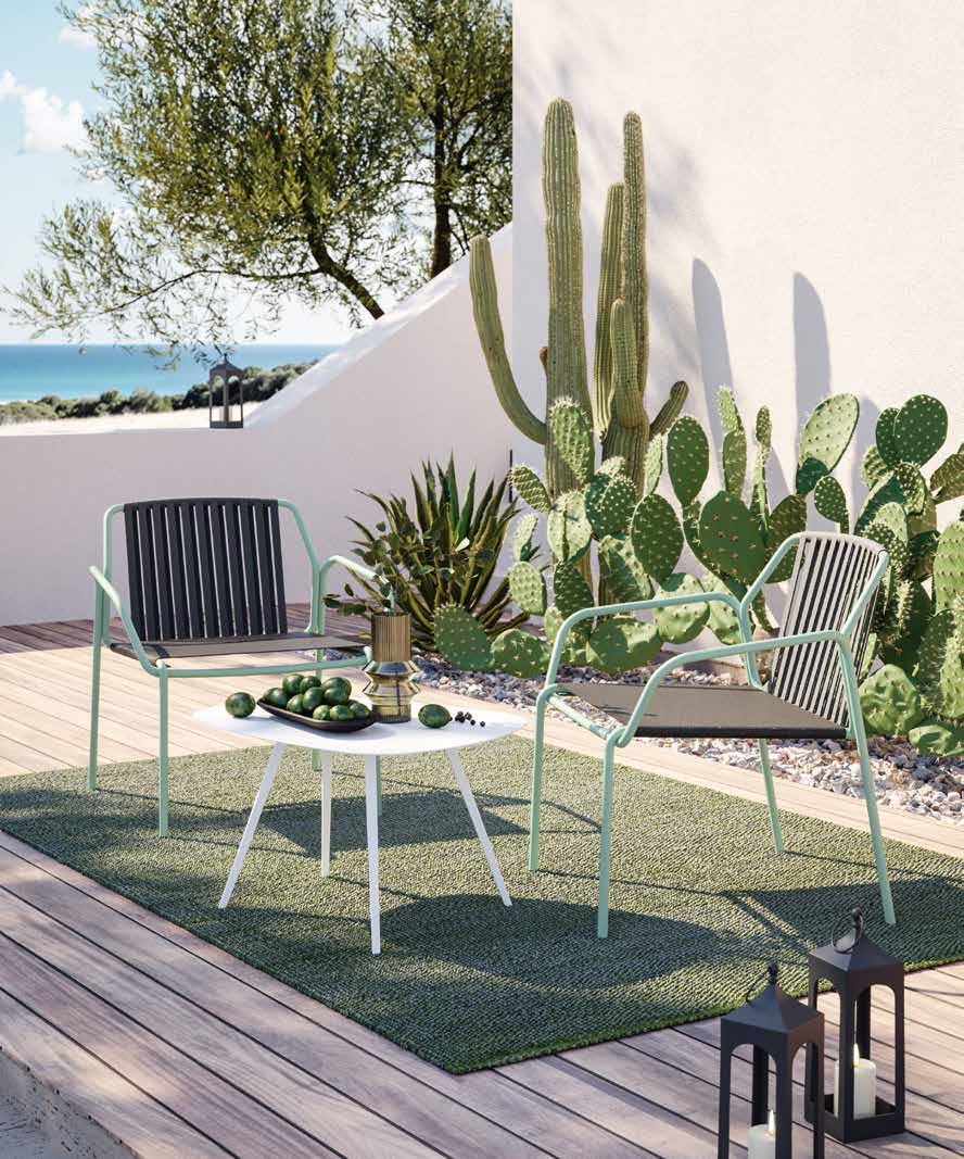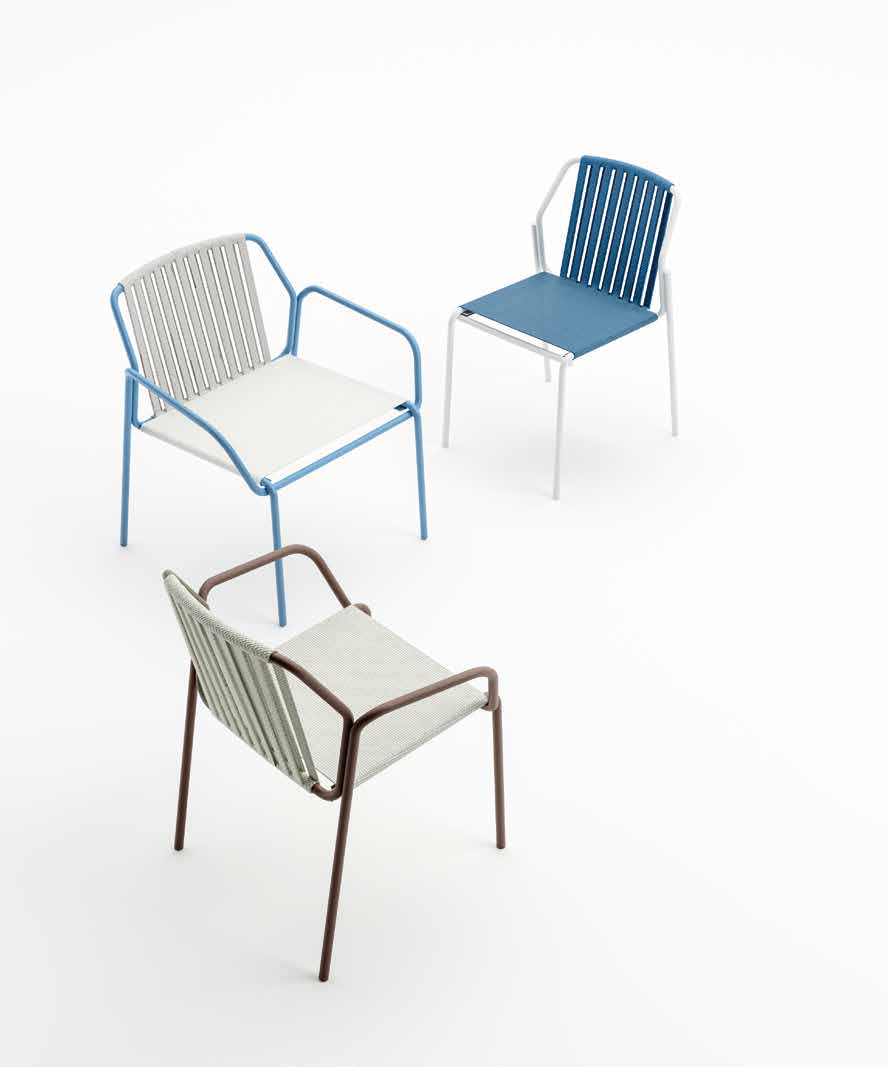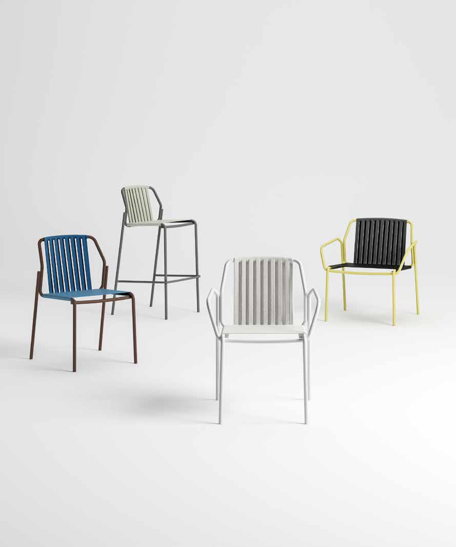 L'assise est caractérisée par une membrane Batyline, légère, élégante, résistante aux rayons UV, aux moisissures, aux intempéries, recyclable et facilement remplaçable.