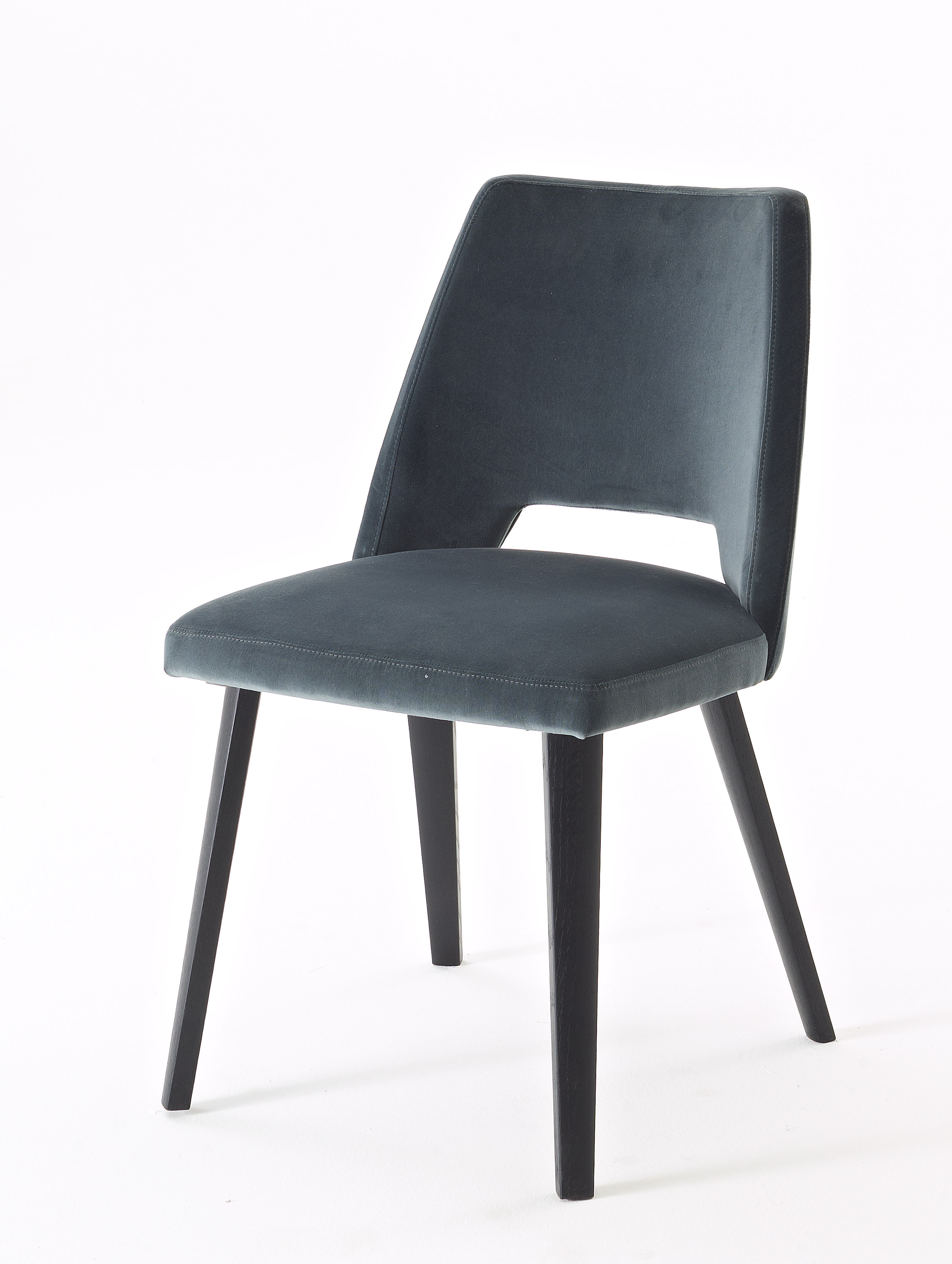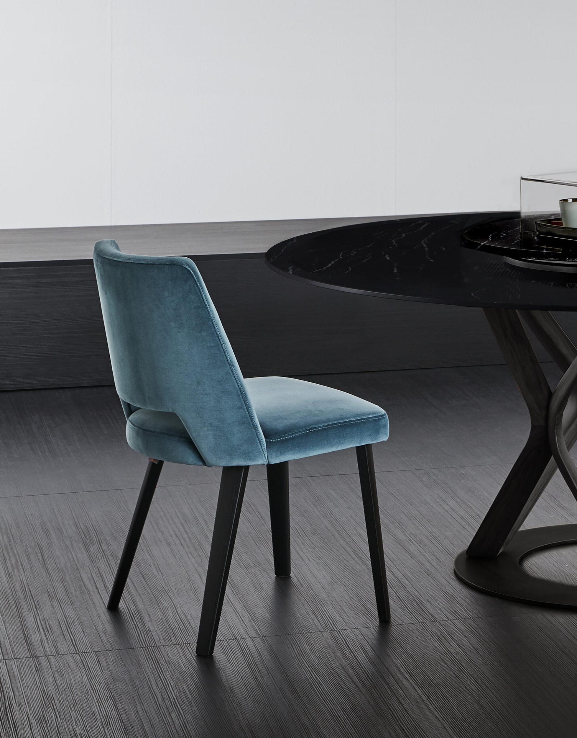 Chaise avec structure rembourrée en chêne, recouverte de tissu ou de cuir.