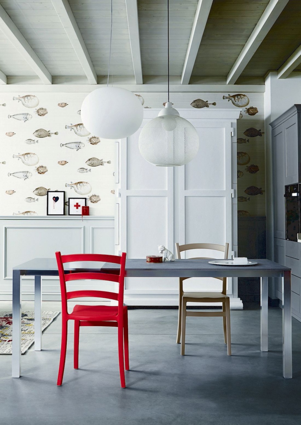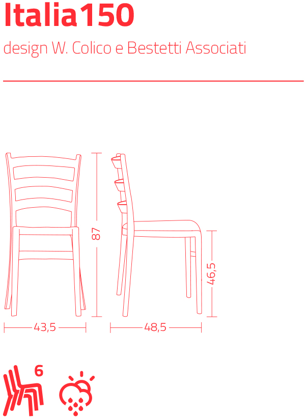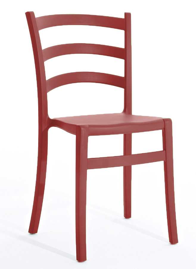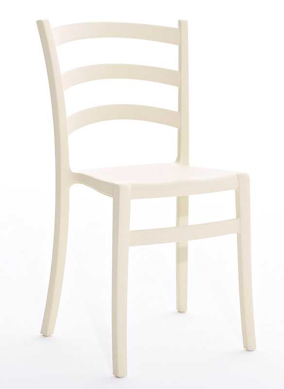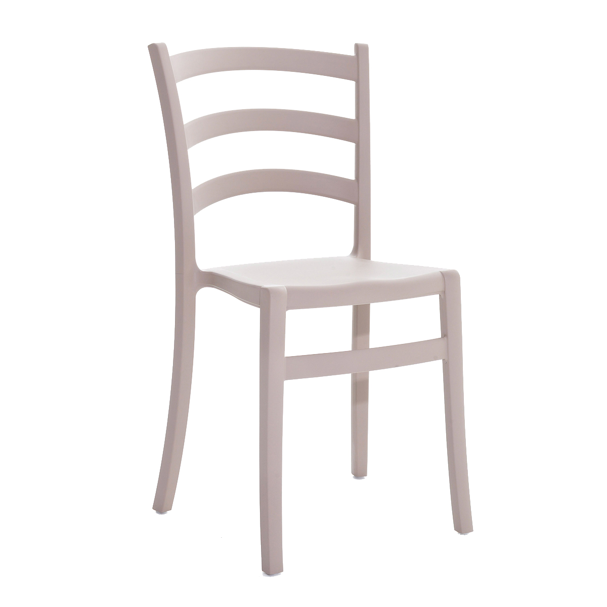 Chaise empilable en polypropylène doux au toucher, recyclable et adaptée à une utilisation en extérieur.