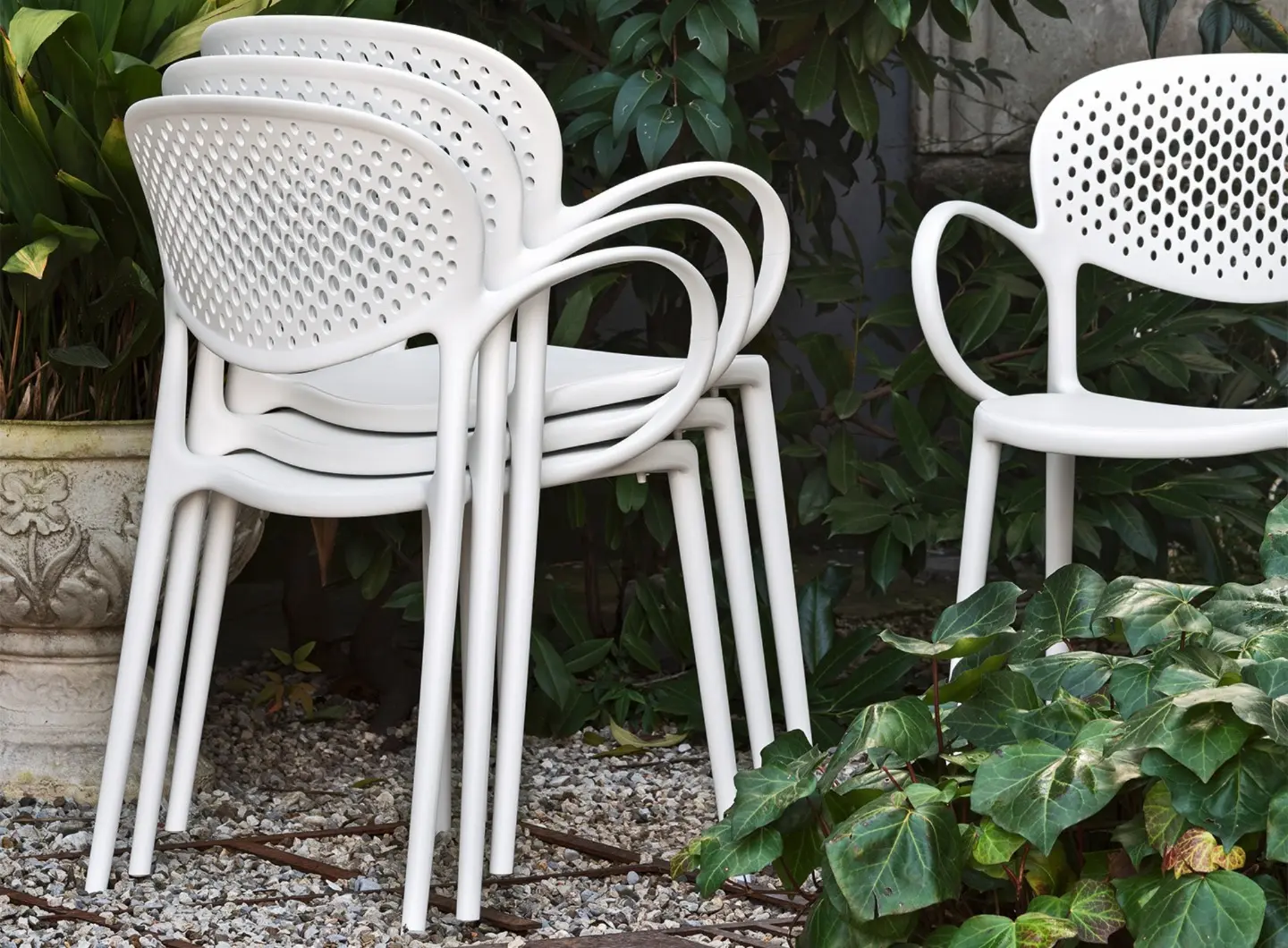 Une composition de trous dégradants décore la surface du dossier, le rendant plus aéré et particulièrement adapté à une utilisation en extérieur.