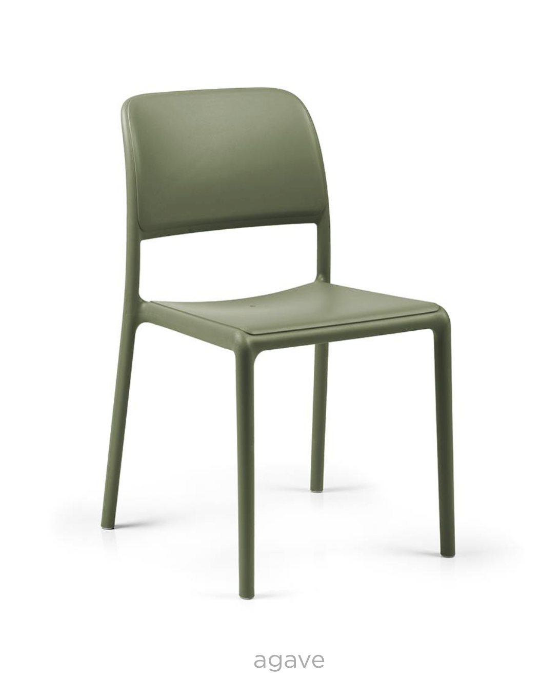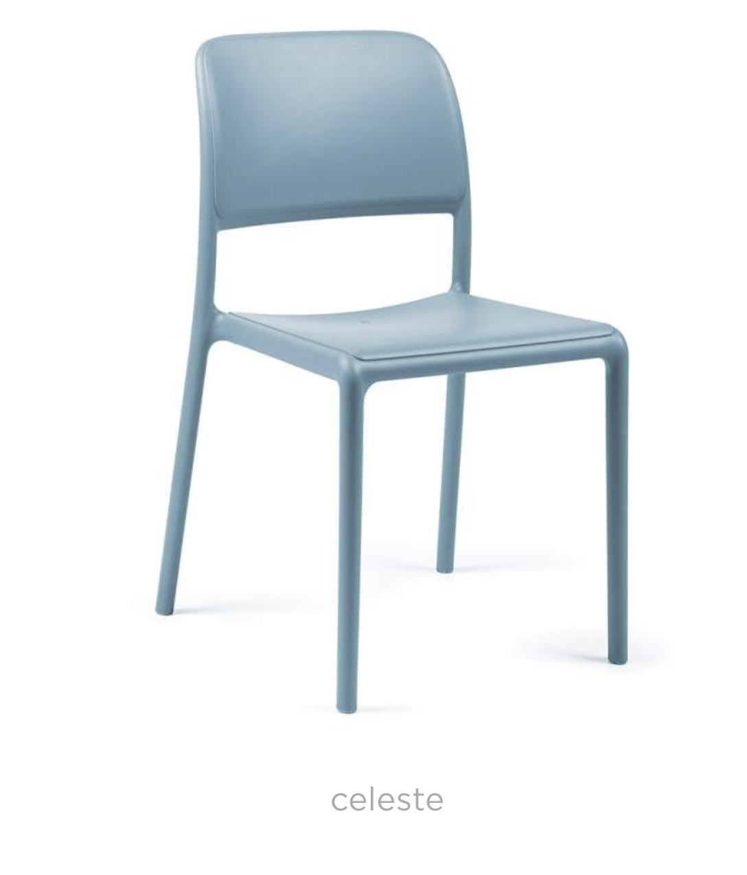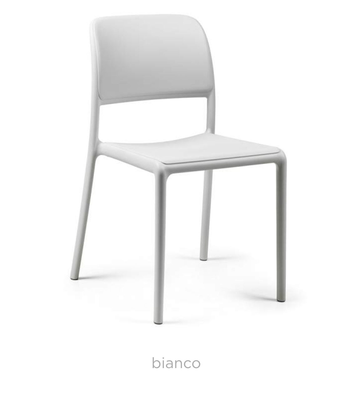 Chaise monobloc sans accoudoirs. Polypropylène fibre de verre traité anti-UV et coloré dans la masse. Finition mate. Pieds antidérapants. Résine recyclable.