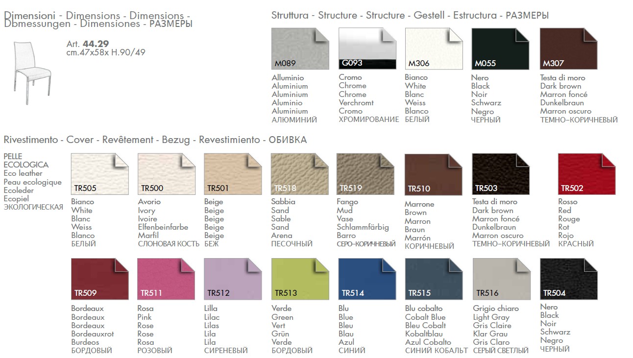 Chaise avec structure en acier ALUMINIUM M089, WHITE M306, DARK BROWN M307, ANTHRACITE M310, BLACK M055, assise et dossier rembourrés recouverts de cuir écologique dans les couleurs: WHITE TR505, IVORY TR500, BEIGE TR501, SAND TR518, MUD TR519, BROWN TR510, BRUN FONCÉ TR503, ROUGE TR502, BORDEAUX TR509, ROSE TR511, LILAS TR512, VERT TR513, BLEU TR514, BLEU COBALT TR515, GRIS CLAIR TR516, ANTHRACITE TR517, NOIR TR504 Dimensions: 47x58xh90 / structure de couleur 49 mail à info@tecnoarredo3.com Supplément pour structure chromée G093, pour plus d'informations contactez-nous à info@tecnoarredo3.com