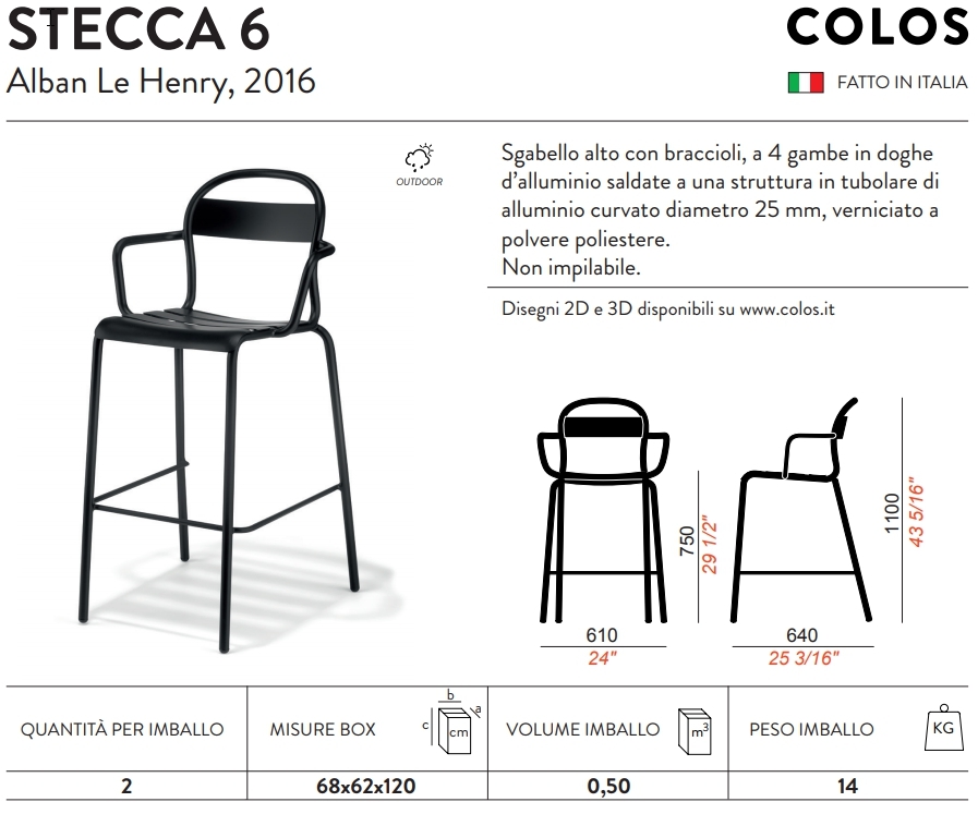 STECCA 6 est la version avec accoudoirs du tabouret haut, qui donne un aspect design encore plus intemporel à ce produit caractéristique.