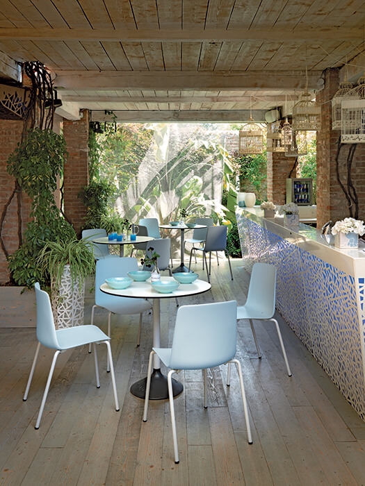 Empilables, ils conviennent à la fois pour les espaces intérieurs, dans la version avec base chromée, et pour l'extérieur dans la version sur base peinte. Le concept est d'offrir une collection de produits volontairement limitée à quelques modèles, orientée vers le secteur de la restauration mais pas seulement, grâce à la polyvalence offerte par le design essentiel et la gamme de combinaisons de couleurs carrosserie / cadre.
