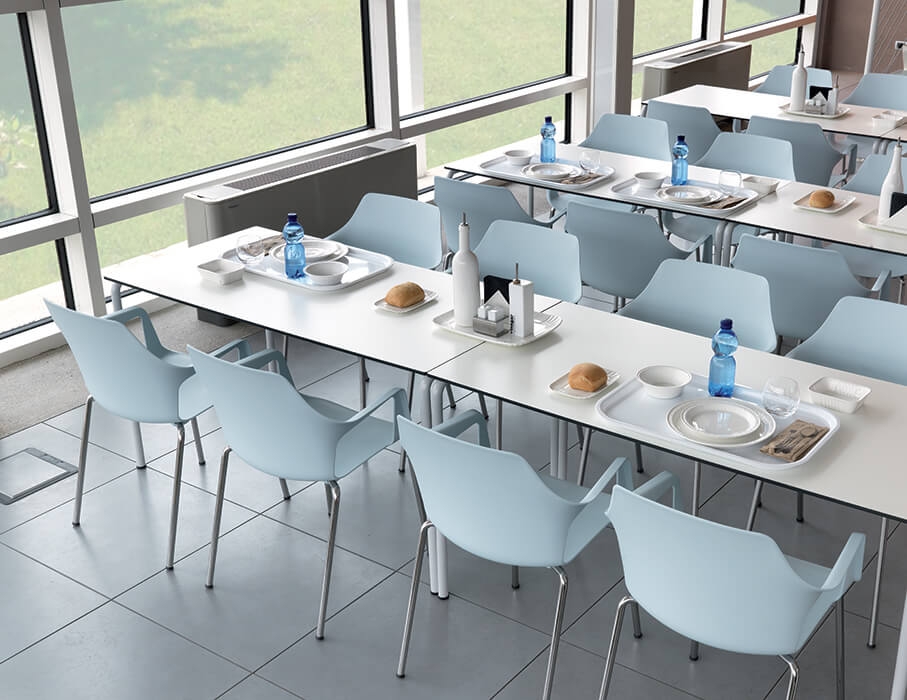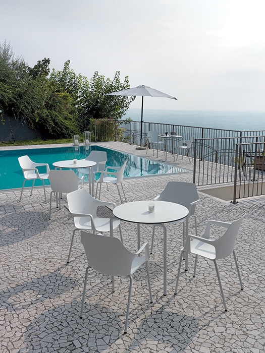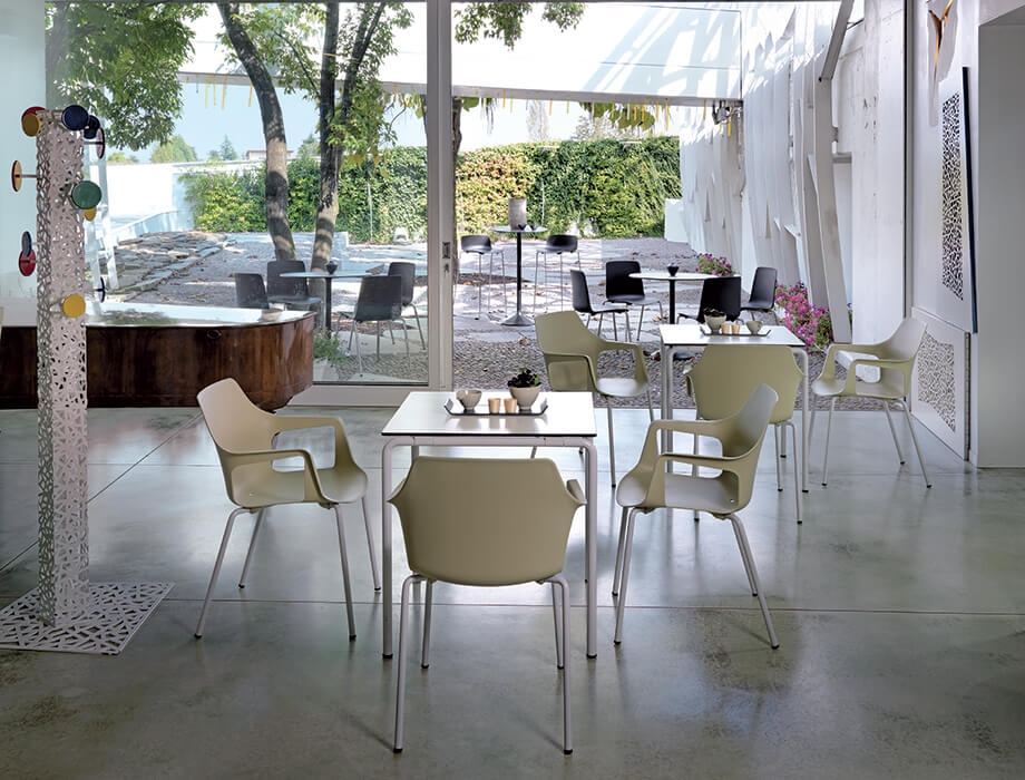 Empilables, ils conviennent à la fois pour les espaces intérieurs, dans la version avec base chromée, et pour l'extérieur dans la version sur base peinte. Le concept est d'offrir une collection de produits volontairement limitée à quelques modèles, orientée vers le secteur de la restauration mais pas seulement, grâce à la polyvalence offerte par le design essentiel et la gamme de combinaisons de couleurs carrosserie / cadre.
