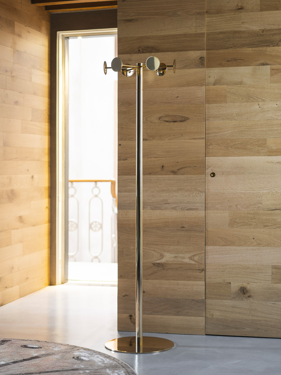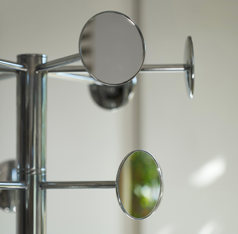 Chaperon est un portemanteau conçu par Bruno Rainaldi pour Opinion Ciatti. Portemanteau avec corolle tournante, simple (6 miroirs) H168 ou quatre éléments (18 miroirs) H178. Dans les finitions : chrome avec miroir argenté, or avec miroir doré.