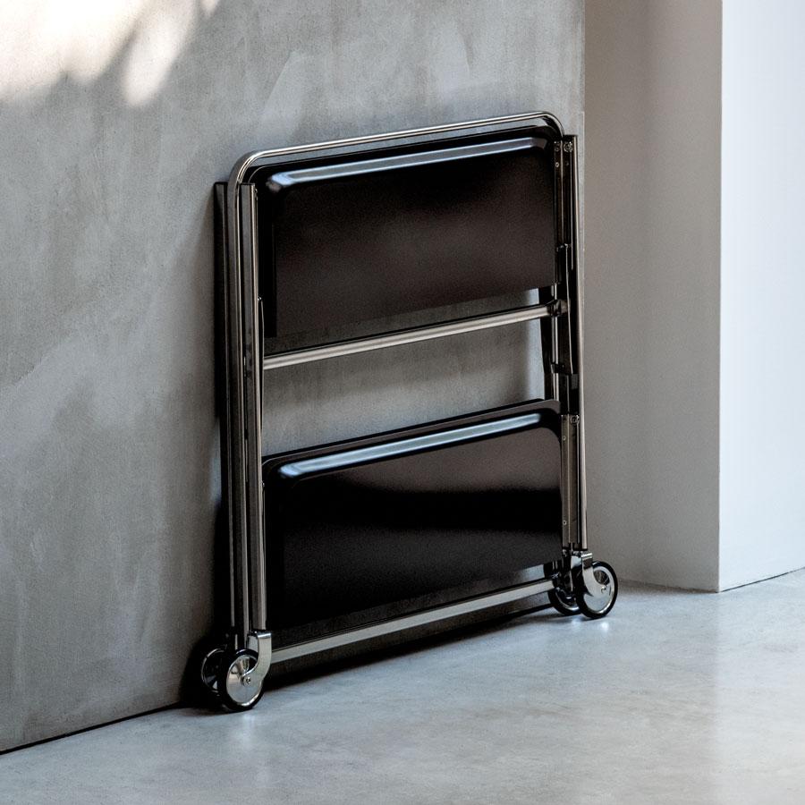 Chariot pliable réalisé avec une structure solide en acier chromé ou peint en finition sablé et des étagères en Formica résistant, garantissant une solidité structurelle maximale.