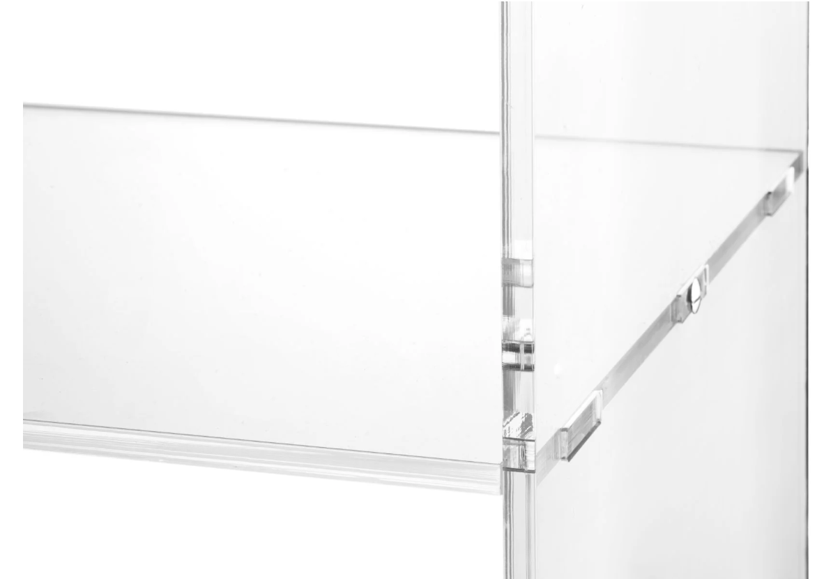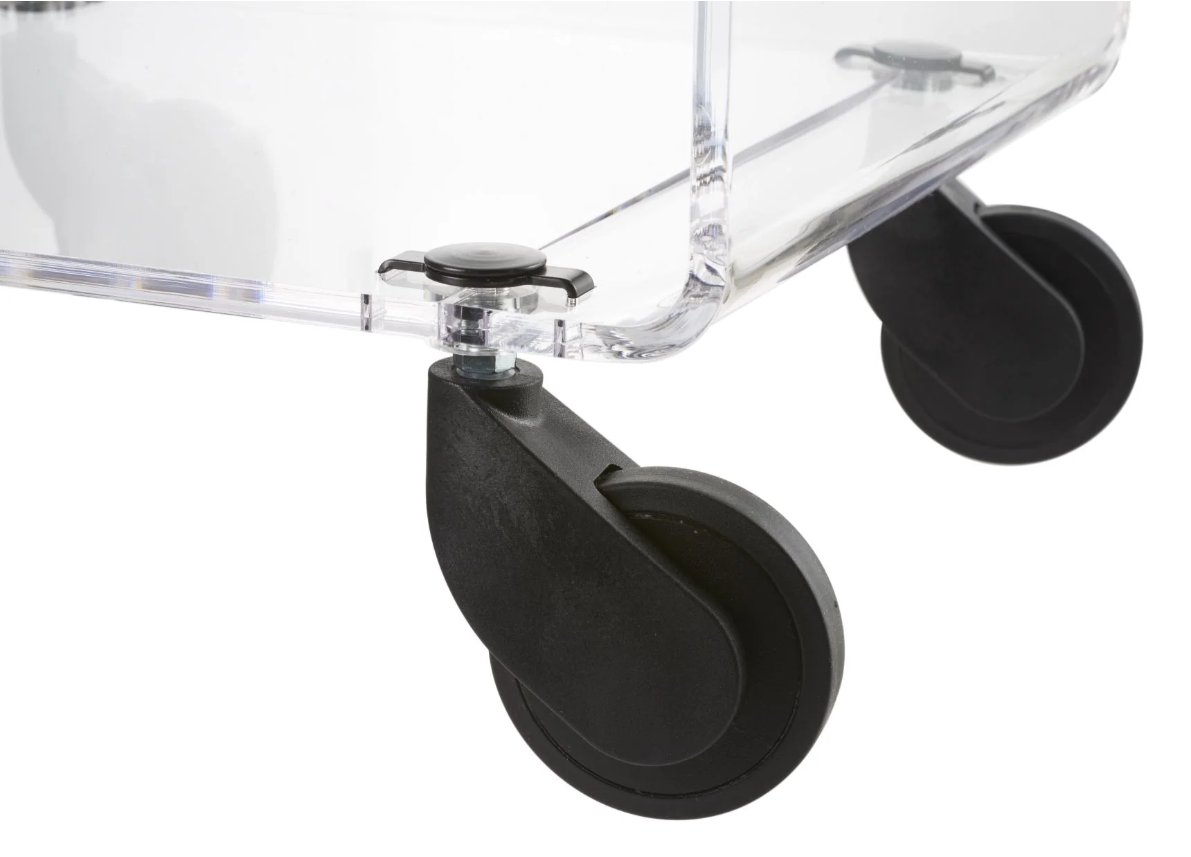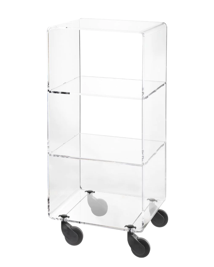 Chariot polyvalent sur roulettes, en méthacrylate transparent.