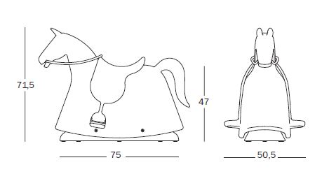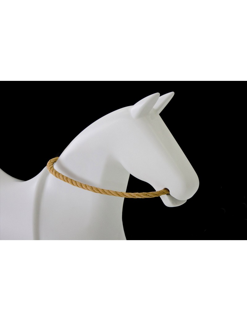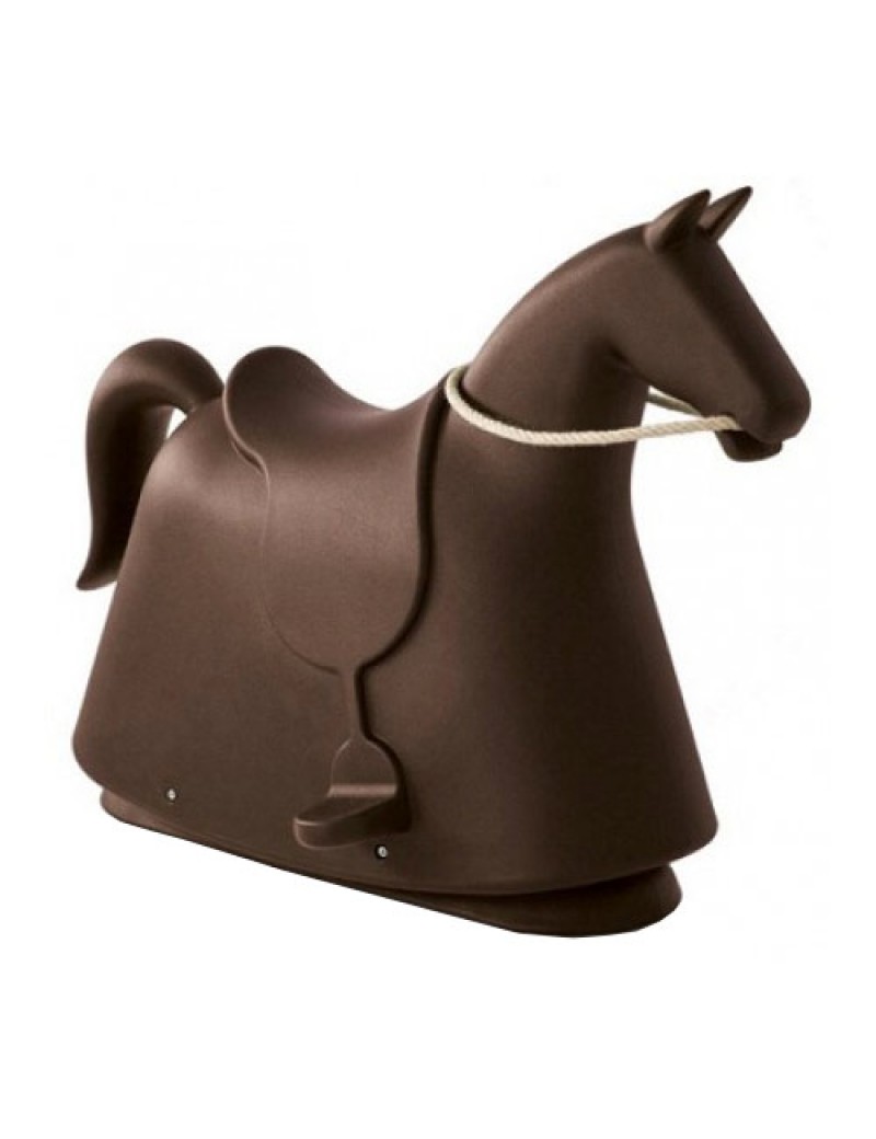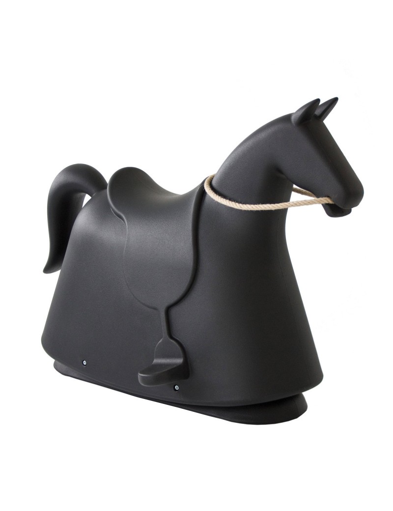 Cheval à bascule en polyéthylène. Renferme en corde de chanvre naturel.