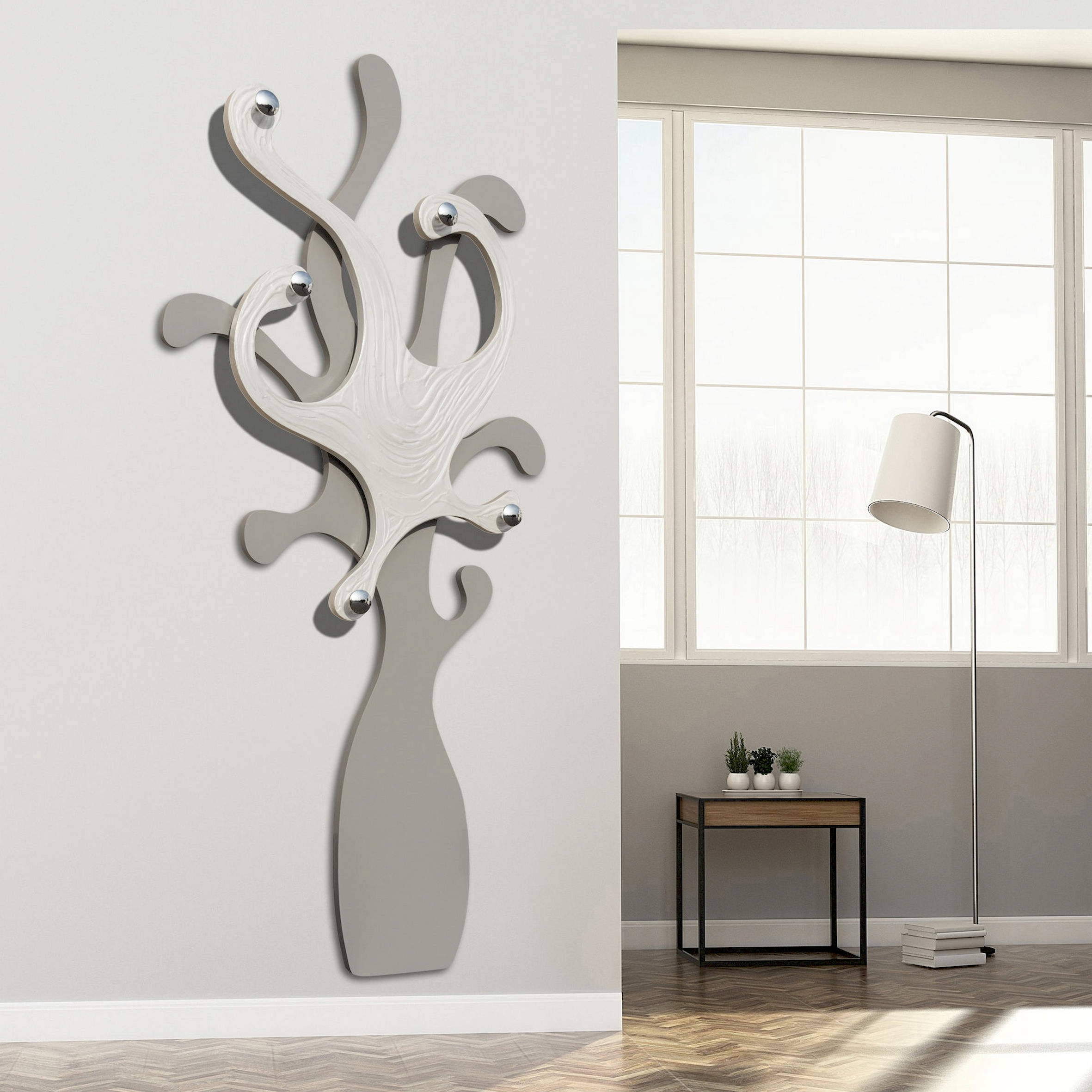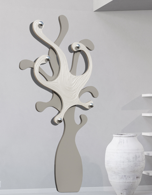 Le portemanteau Octopus Blanc P2479 de Pintdecor est un meuble au design unique, idéal pour ceux qui recherchent élégance et fonctionnalité. Doté d'une structure profilée laquée gris tourterelle et de cinq boutons chromés, ce portemanteau se distingue par son travail texturé en relief, décoré à la main d'un effet nacre.