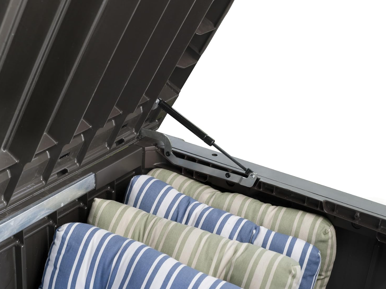 Le couvercle est équipé de pistons à gaz pour une ouverture facile et peut également être utilisé comme siège pour deux personnes jusqu'à 300 kg.
