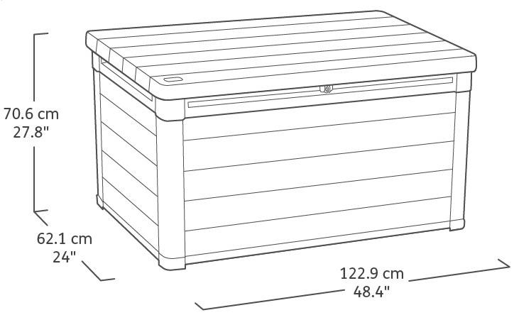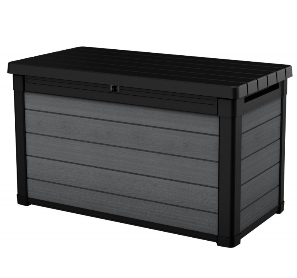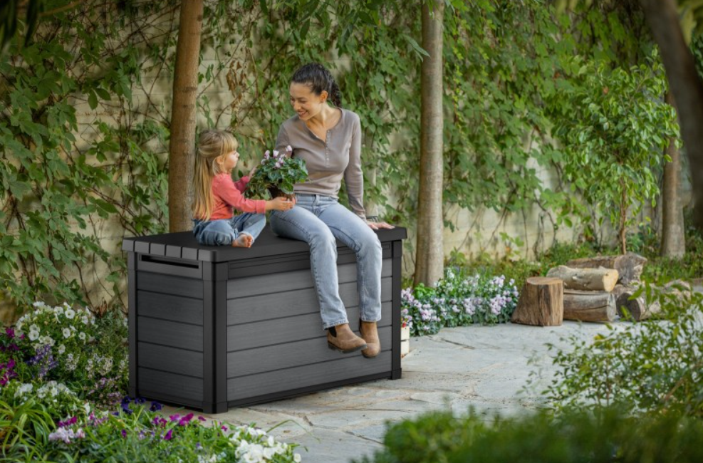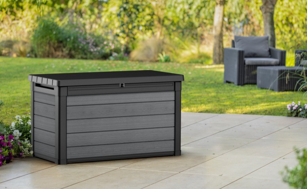 Le coffre à outils Keter Cortina Box est la solution idéale pour organiser et protéger les accessoires de jardin, les coussins ou les petits meubles, avec un design compact et moderne effet bois.