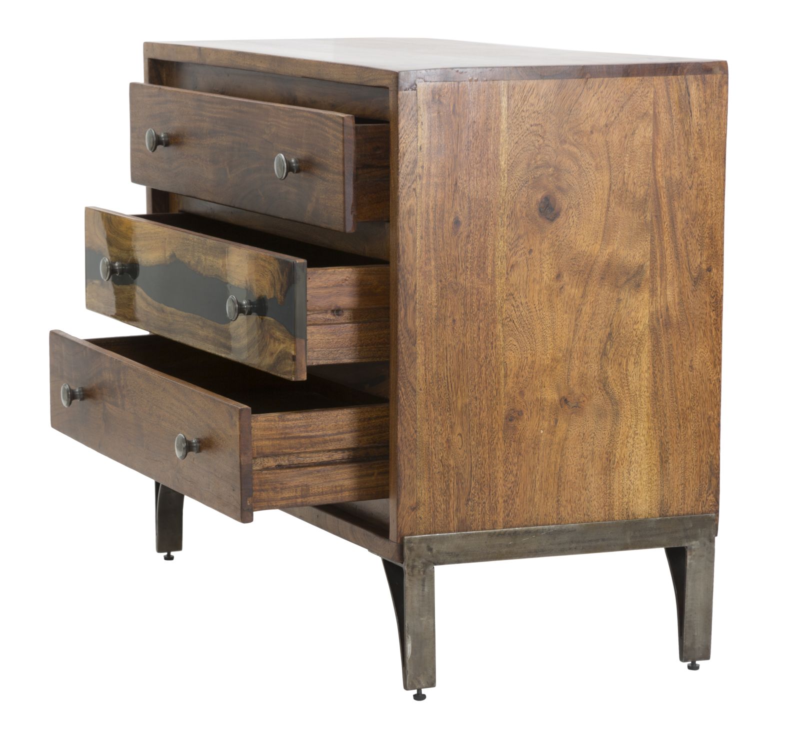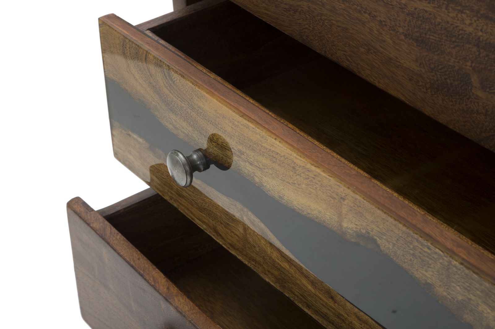 Commode élégante en bois d'acacia massif avec 3 tiroirs. La finition particulière avec de la résine fixée sur les tiroirs donne une touche de couleur et de modernité à une pièce extrêmement élégante et classique.