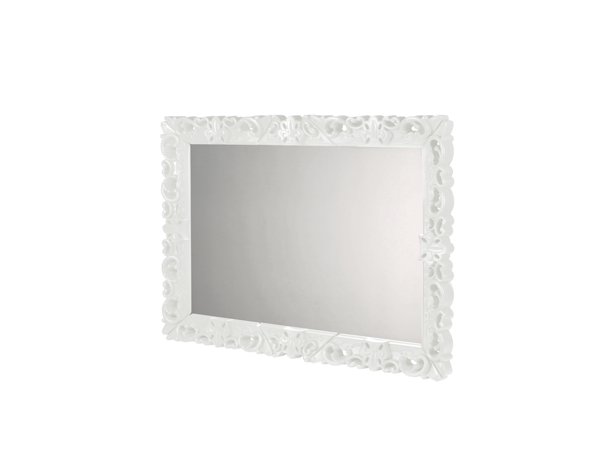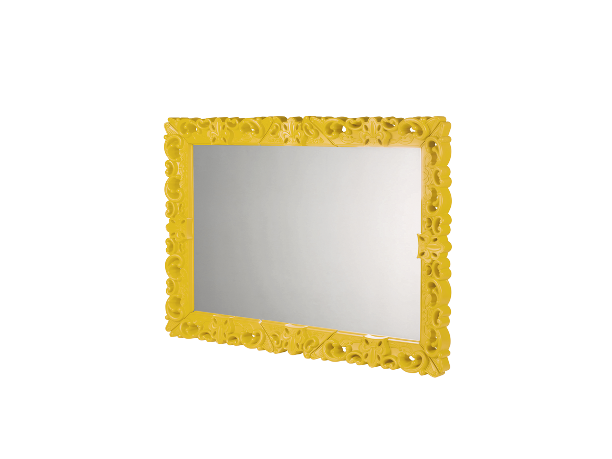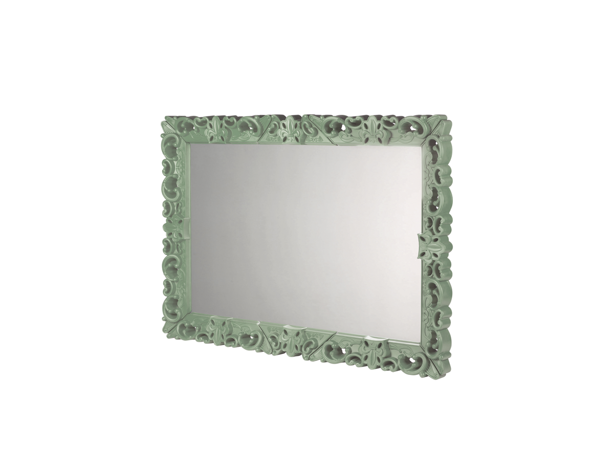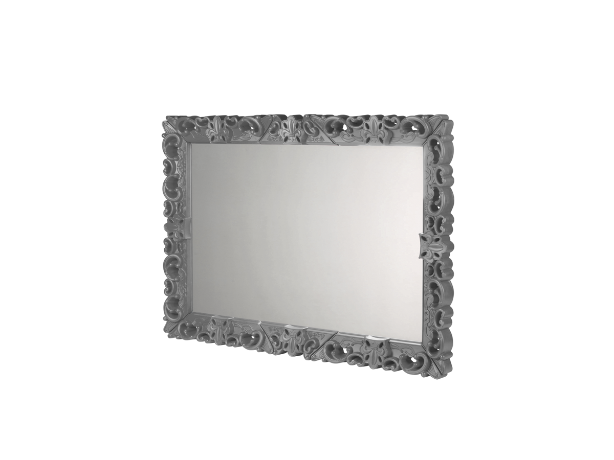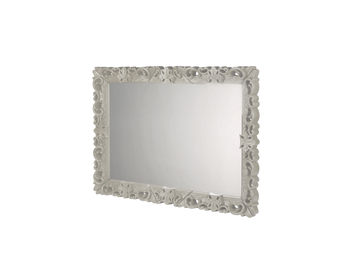 Le Mirror of Love - XL est un objet très unique avec ses dimensions remarquables et ses détails complexes de style rococo, qui ne peuvent sans aucun doute passer inaperçus. La taille imposante des côtés 162 cm sur 223 cm, permet au Miroir de l'Amour, avec sa majesté, de devenir le protagoniste des grands volumes de salles, d'expositions et de galeries, s'intégrant dans la philosophie de macro design récemment présentée par SLIDE.