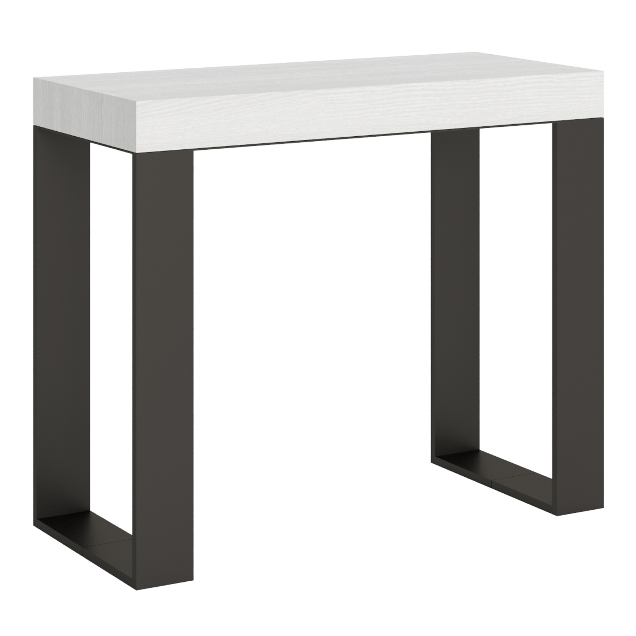 Console extensible Tecno Small, polyvalente et robuste, un complément parfait pour chaque pièce de la maison : entrée, cuisine, salle à manger, salon ou couloir. La console extensible Tecno Small peut être facilement transformée en une grande table à manger pouvant atteindre 196 cm de longueur, pouvant accueillir jusqu'à 10 personnes. Realisée avec des panneaux en mélaminé, pieds en fer. Le système d'extensions avec des guides télescopiques en aluminium et le support central inclus rendent la console stable et robuste. Une fois que la console est fermée, les extensions doivent être rangées ailleurs. Produit Itamoby Made in Italy Dimensions: Console fermée: L.90 P.40 H.77 cm Longueur avec 1 extension: 92 cm Longueur avec 2 extensions: 144 cm Longueur avec 3 extensions: 196 cm