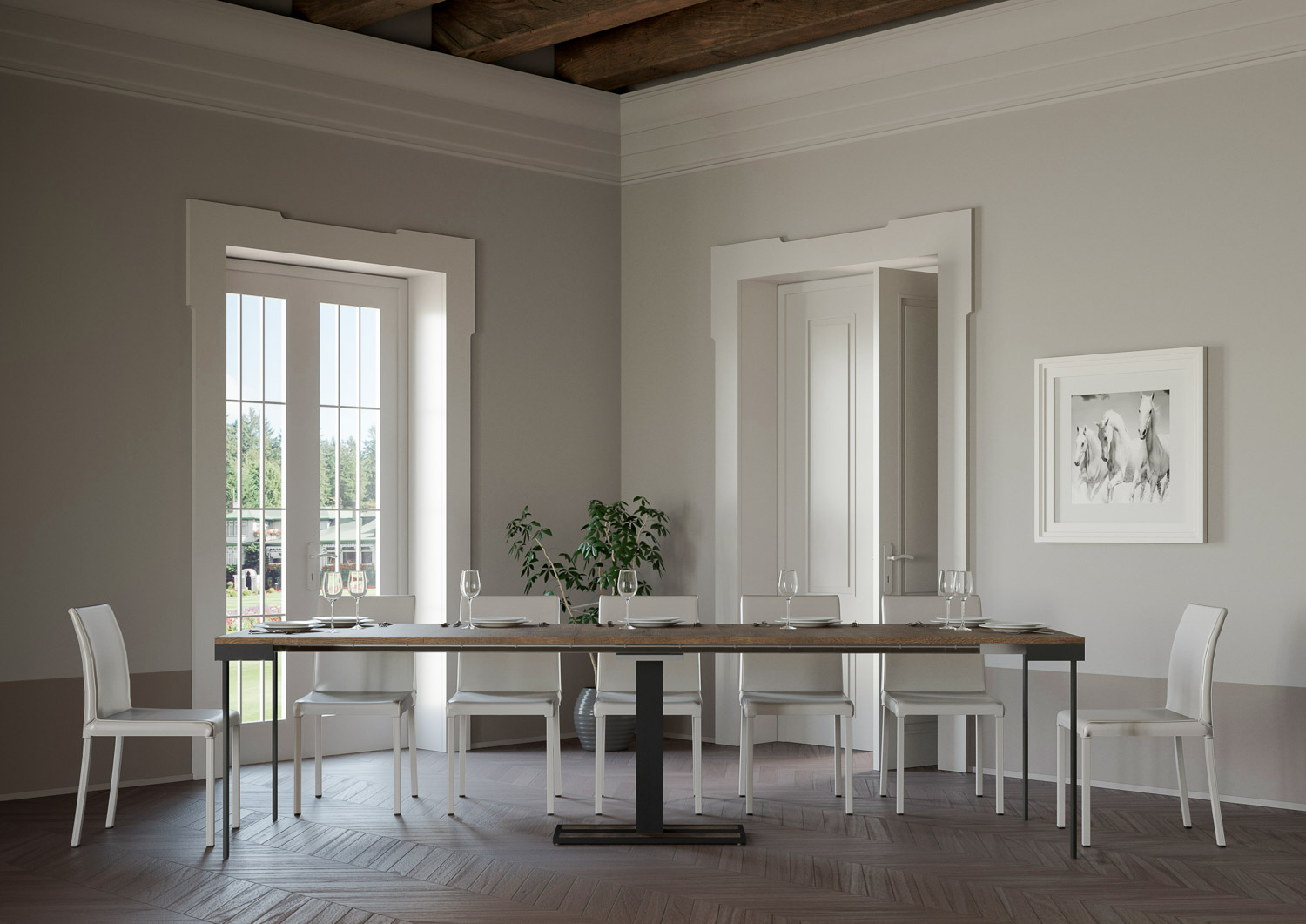 Polyvalente et robuste, la console extensible Capital Evolution s'intègre parfaitement dans toutes les pièces de la maison : entrée, cuisine, salle à manger, salon ou couloir. Transformable en une grande table à manger jusqu'à 300 cm de long, elle peut accueillir jusqu'à 14 personnes. Fabriquée en panneaux mélaminés, elle est dotée d'une structure et de pieds en fer. Son système d'extension avec glissières télescopiques en aluminium et ses supports latéraux inclus garantissent stabilité et robustesse. Une fois repliée, les rallonges se rangent facilement. Produit Itamoby. Fabriqué en Italie. Dimensions : Console fermée : L 90 P 40 H 77 cm. Longueur avec 1 rallonge : 92 cm. Longueur avec 2 rallonges : 144 cm. Longueur avec 3 rallonges : 196 cm. Longueur avec 4 rallonges : 248 cm. Longueur avec 5 rallonges : 300 cm.