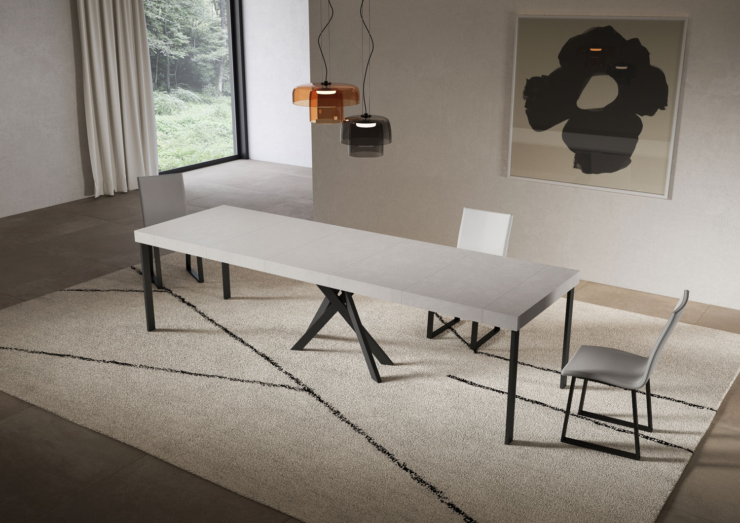 Console extensible Saki Premium , polyvalente et robuste, un complément parfait pour chaque pièce de la maison : entrée, cuisine, salle à manger, salon ou couloir. La console extensible Saki Premium peut être facilement transformée en une grande table à manger pouvant atteindre 300 cm de longueur, pouvant accueillir jusqu'à 14 personnes. Realisée avec des panneaux en mélaminé, des pieds en fer, plateau et extensions usinés avec une finition de type Folding. Le système d'extensions avec des guides télescopiques en aluminium et les supports lateraux inclus rendent la console stable et robuste. Une fois que la console est fermée, les extensions doivent être rangées ailleurs. Produit Itamoby Made in Italy Dimensions: Console fermée: L.90 P.40 H.77 cm Longueur avec 1 extension: 92 cm Longueur avec 2 extensions: 144 cm Longueur avec 3 extensions: 196 cm Longueur avec 4 extensions: 248 cm Longueur avec 5 extensions: 300 cm