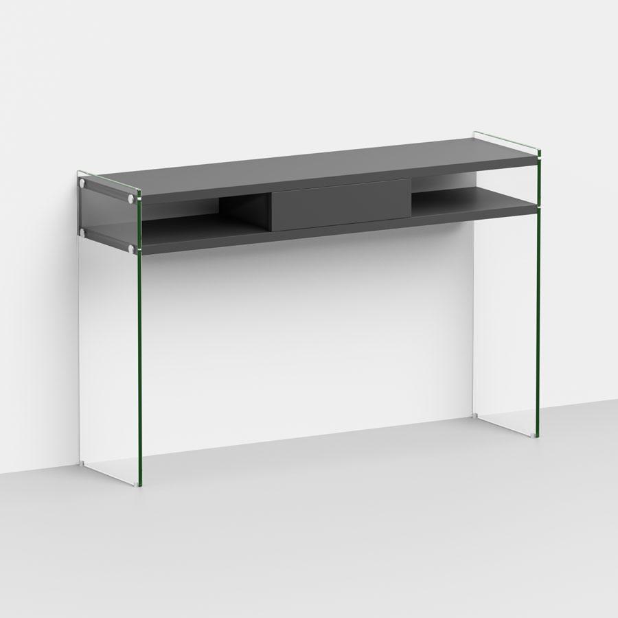 Console Maya avec tiroir, réalisée en stratifié écologique de 25 mm pour le plateau et 18 mm pour le corps, avec côtés en verre trempé de 10 mm d'épaisseur.