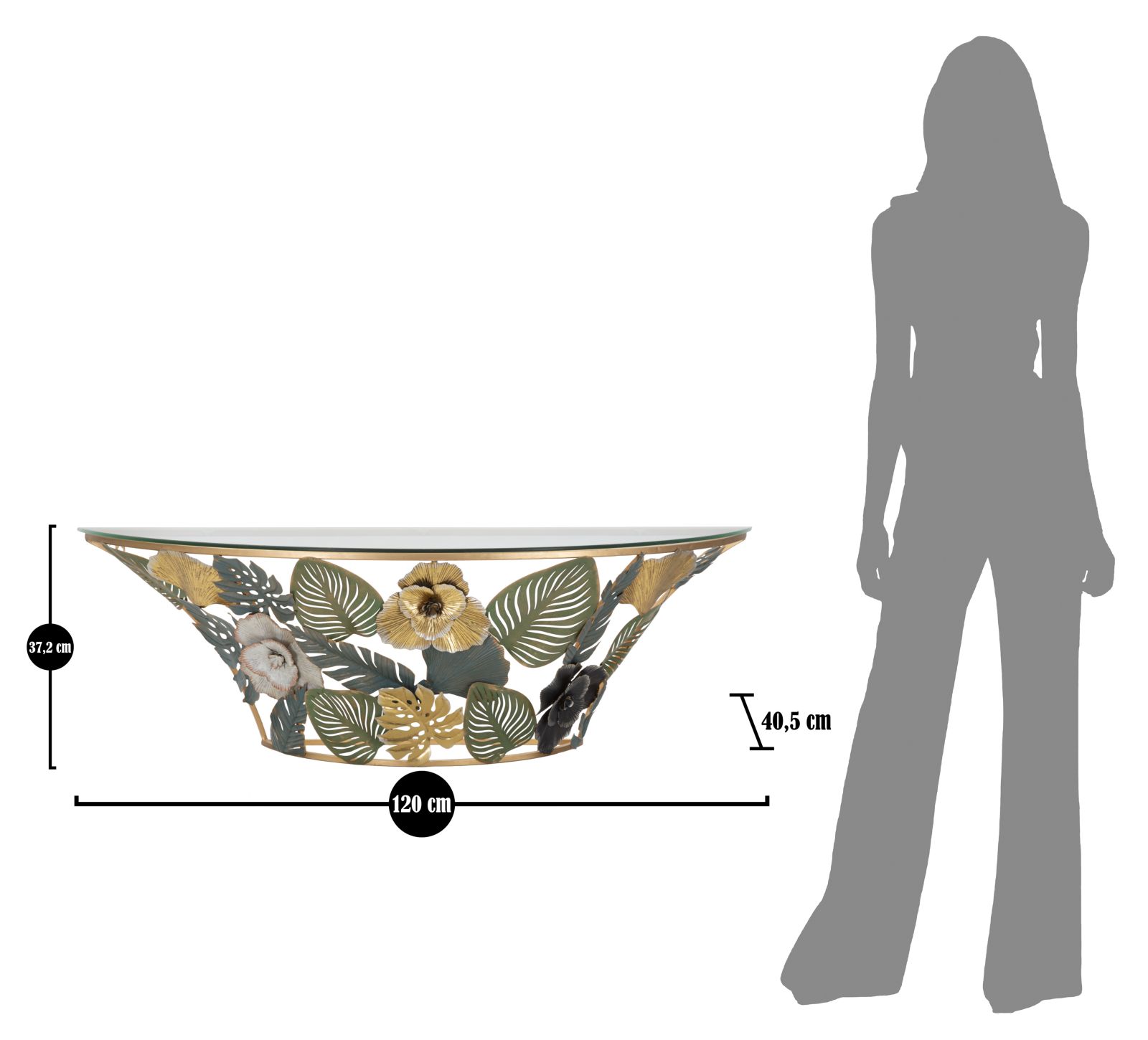 Console murale semi-circulaire en métal doré avec plateau en verre. La base est richement décorée de feuilles et de fleurs de différentes couleurs. Le design particulier donne une touche de classe et de détente à n'importe quel environnement.