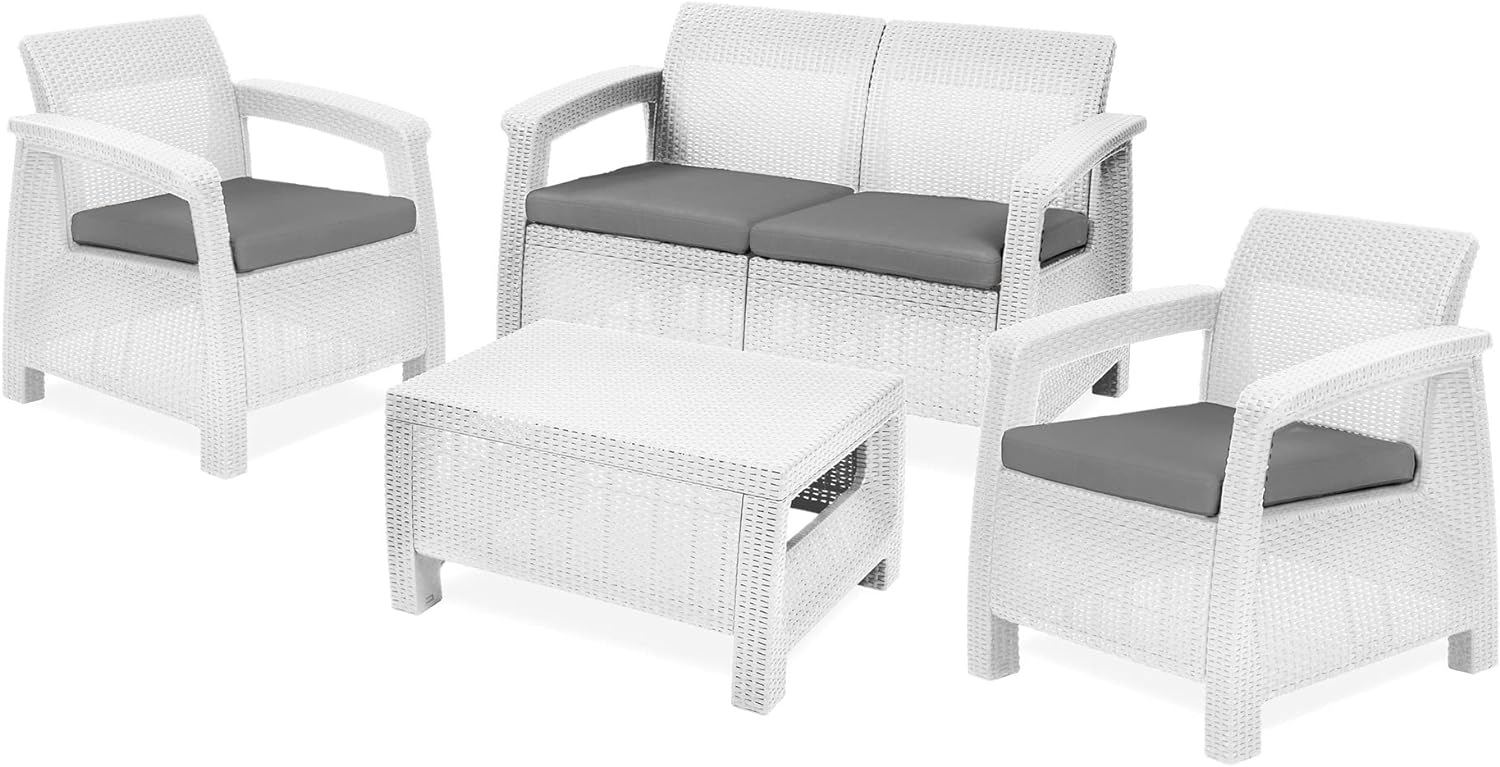 L'ensemble Keter Corfu est un élégant salon de jardin en rotin polypropylène résistant aux intempéries et aux UV, garantissant durabilité et entretien facile.