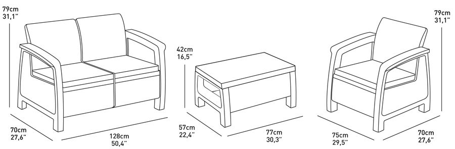 Il comprend un canapé, deux fauteuils et une table basse avec un plateau robuste, le tout accompagné de coussins moelleux inclus pour un confort optimal.