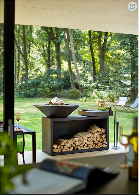 OFYR ISLAND - BRASIER BARBECUE AVEC PORTE-BOIS ET PLAN DE SUPPORT EN BOIS DE TECK