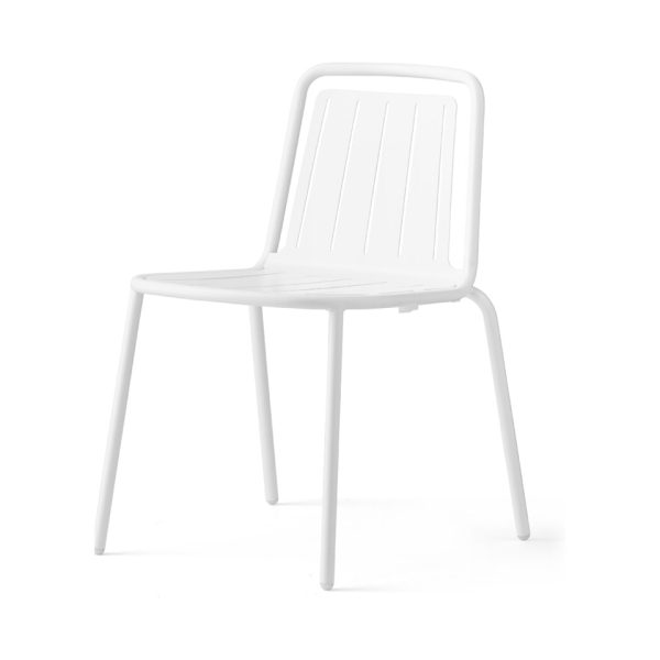 La structure et l'assise de la chaise sont réalisées en métal peint, avec des matériaux spécifiquement traités pour résister à une utilisation en extérieur, garantissant durabilité et résistance aux agents atmosphériques.