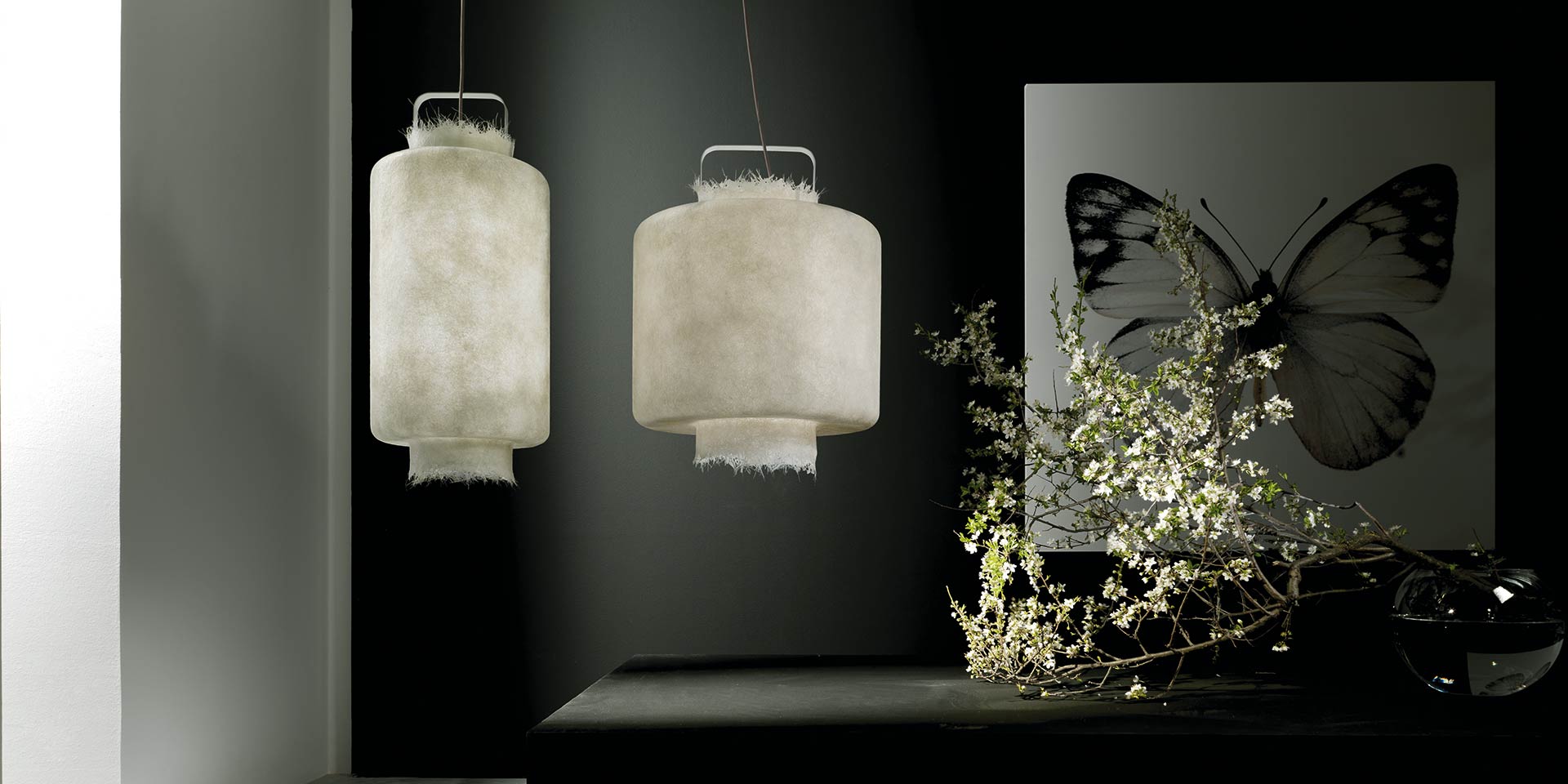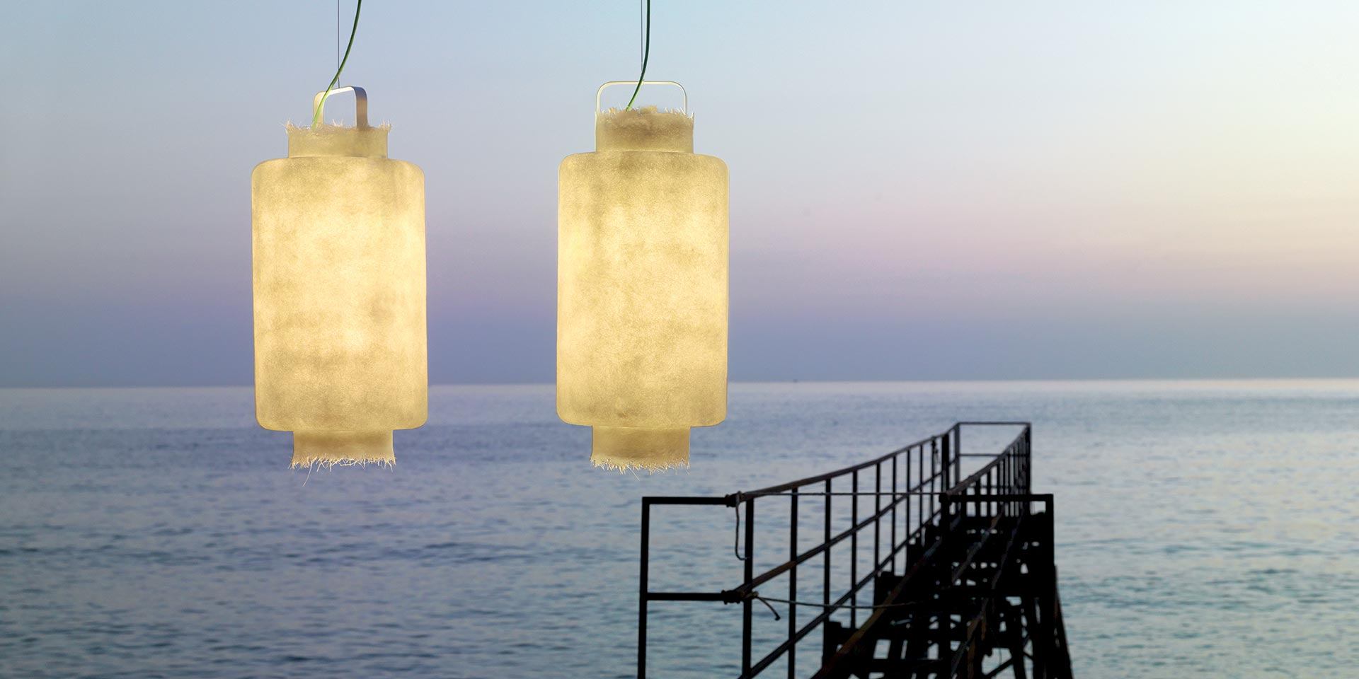 Kimono Karman, une suspension d'extérieur à la lumière chaude et pleine, une lanterne qui fascine le regard et retient la lumière, avec sa forme elle semble se confondre avec l'air qui l'entoure. KIMONO, une suspension pour l'intérieur et l'extérieur capable de meubler votre jardin avec une touche vraiment originale et sûre, grâce au degré de protection IP65.