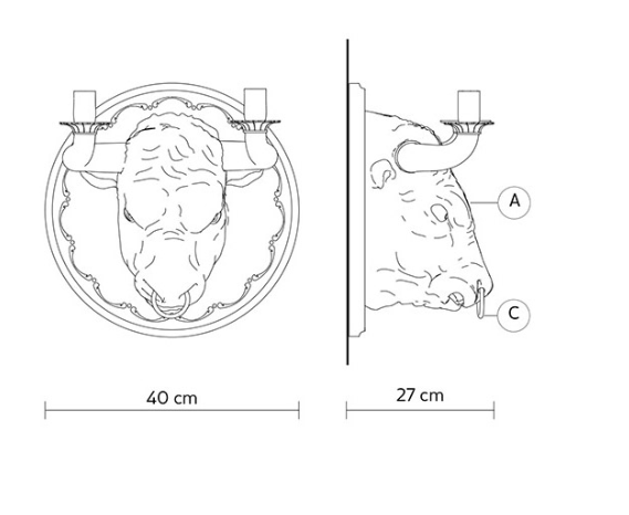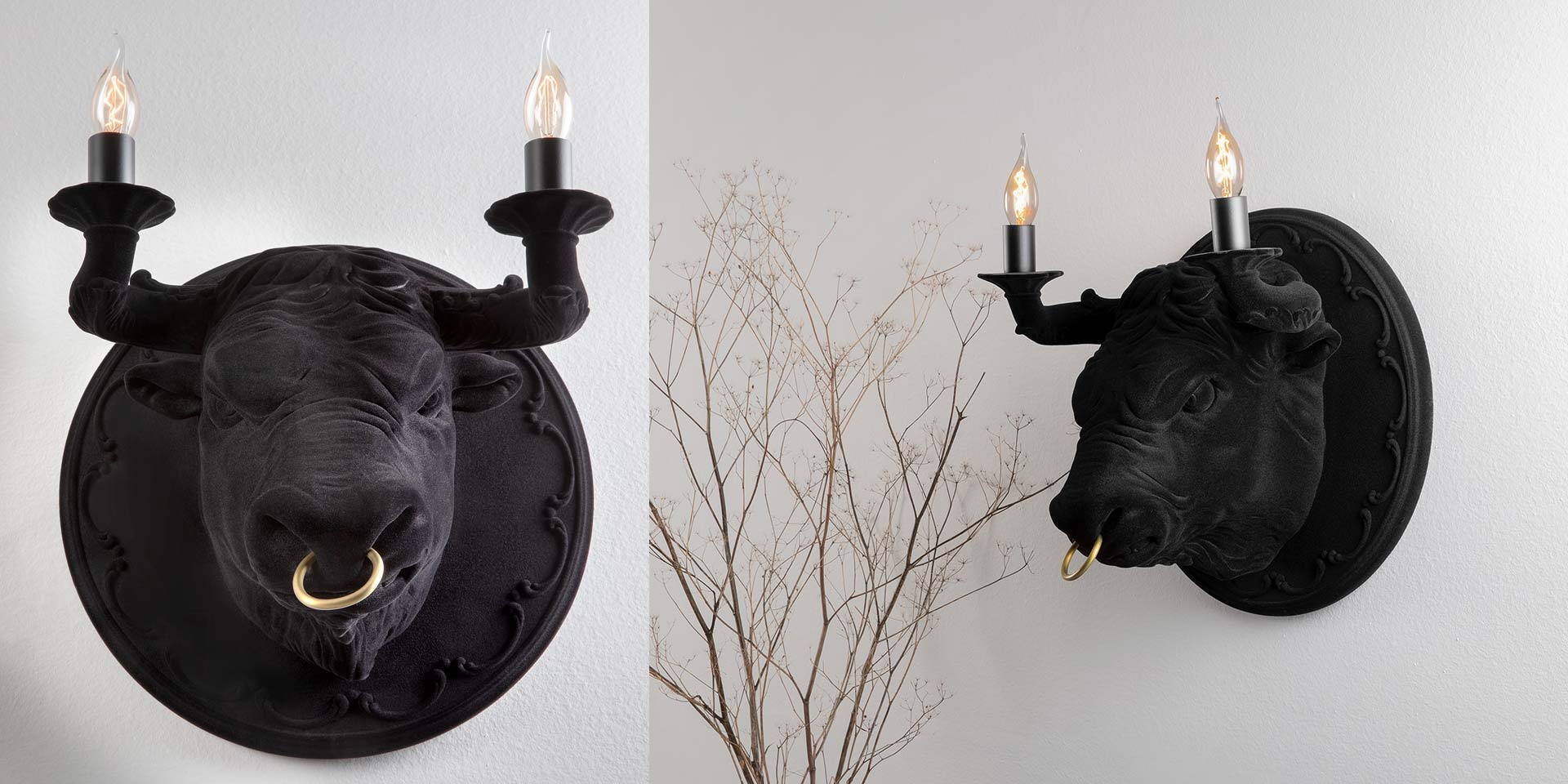 Et la tête de Taureau, symbole de fureur mais aussi de force virile, complétée par des cornes lumineuses et un anneau nasal, est la nouvelle applique de Matteo Ugolini.‎