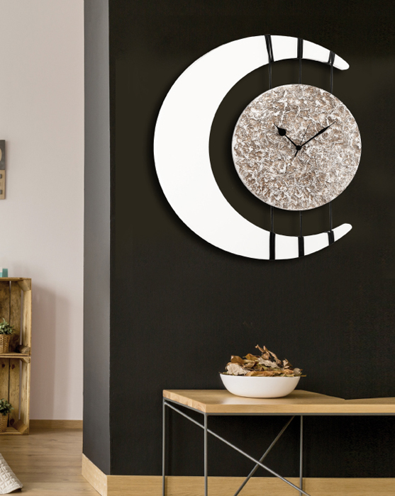 Horloge de forme laquée ivoire, décorée à la main de feuille d'argent sur la matière, élément suspendu à des cordes.