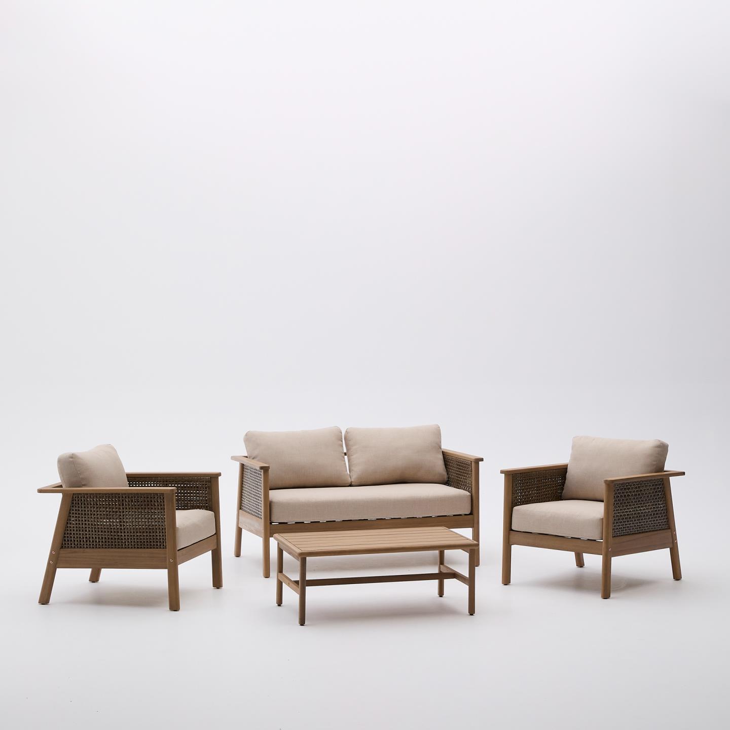 | Matériel | 70 % bois d'acacia (Acacia Mangium), 15 % osier synthétique, 8 % mousse (polyuréthane), 5 % tissu, 2 % sangle |