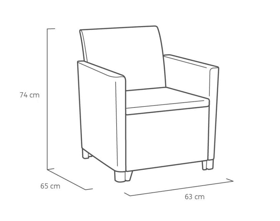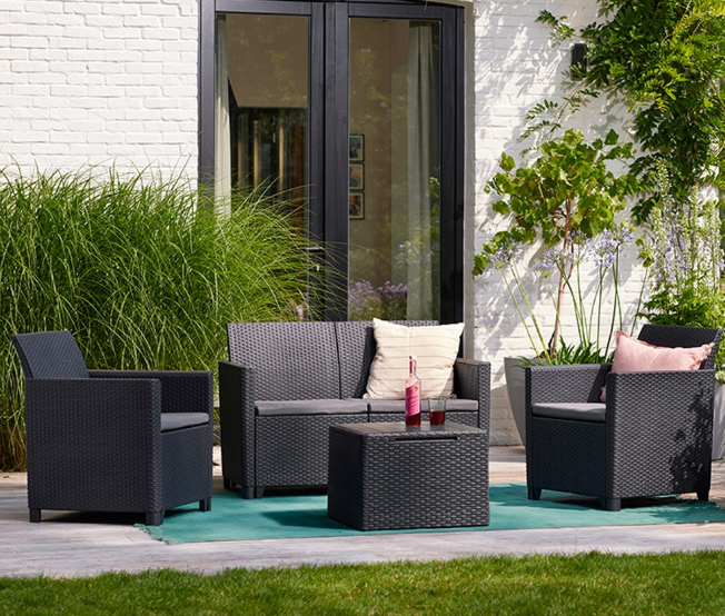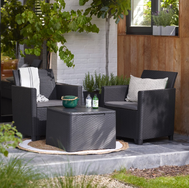 L'ensemble Claire de Keter est un salon de jardin élégant et fonctionnel, réalisé en résine tressée effet rotin et polypropylène, résistant aux intempéries et aux rayons UV.