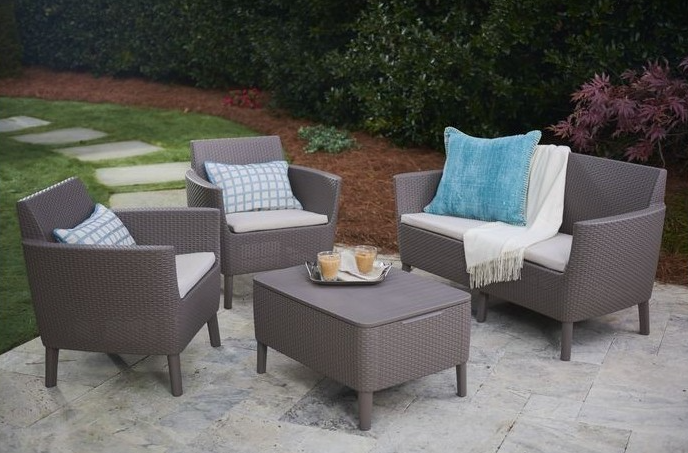 L'ensemble Carolina de Keter se compose d'un canapé, de deux fauteuils et d'une table basse relevable avec une finition en résine effet bois.