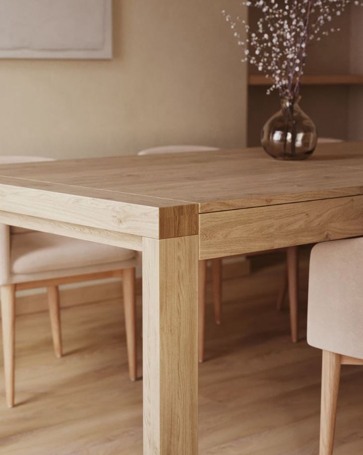 • Plateau en placage de chêne qui rend chaque table unique, avec le grain et les nuances du bois.